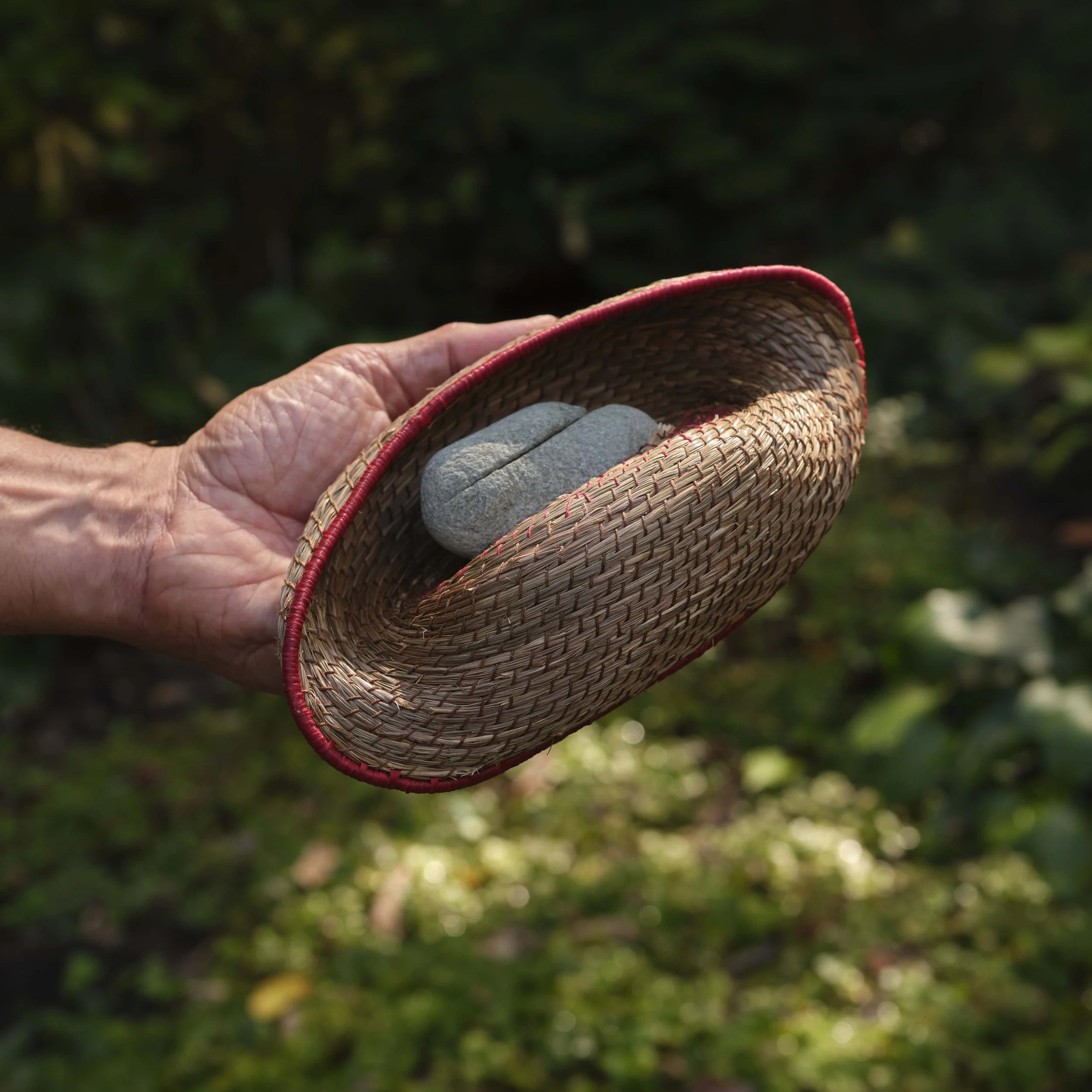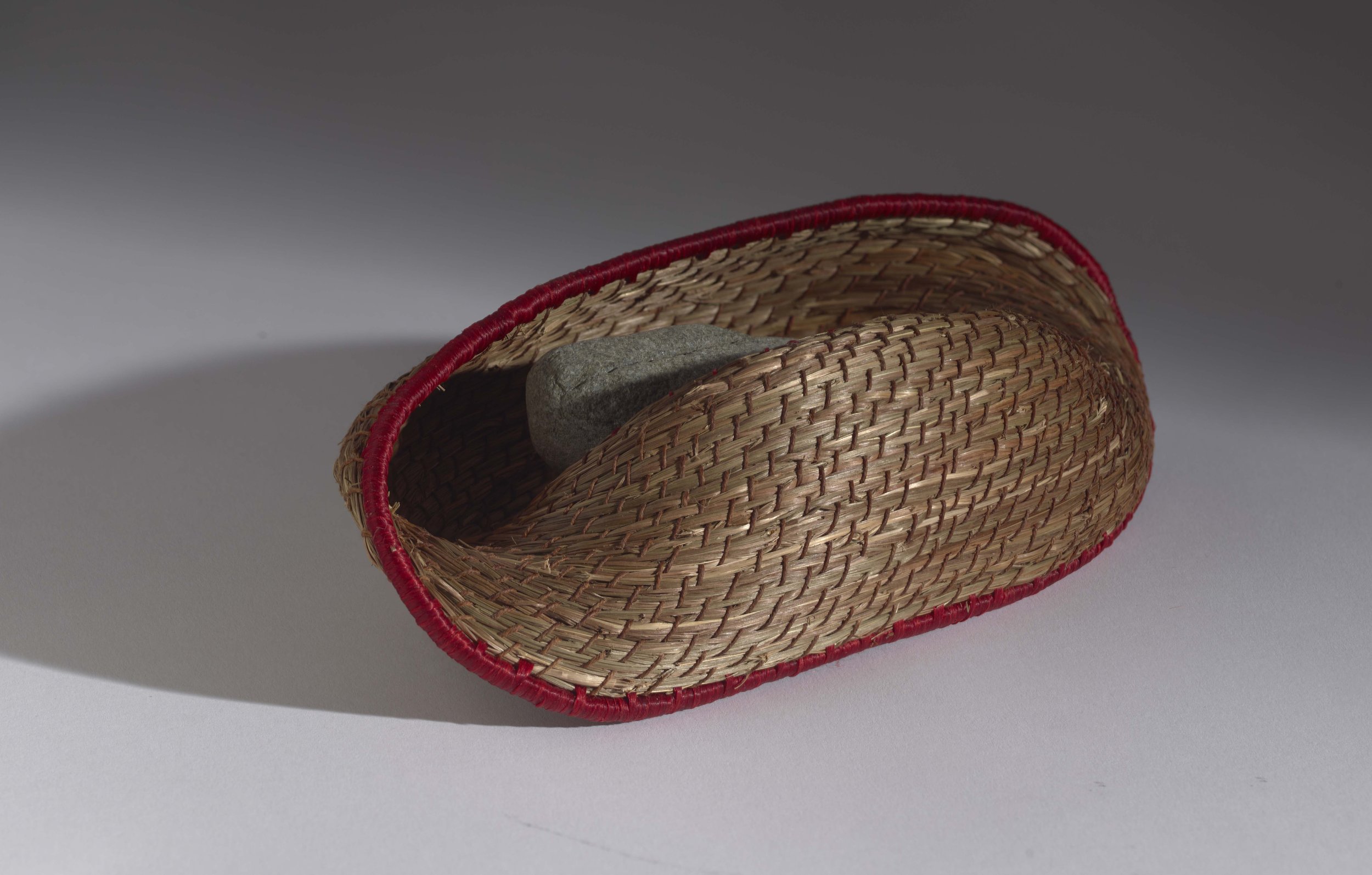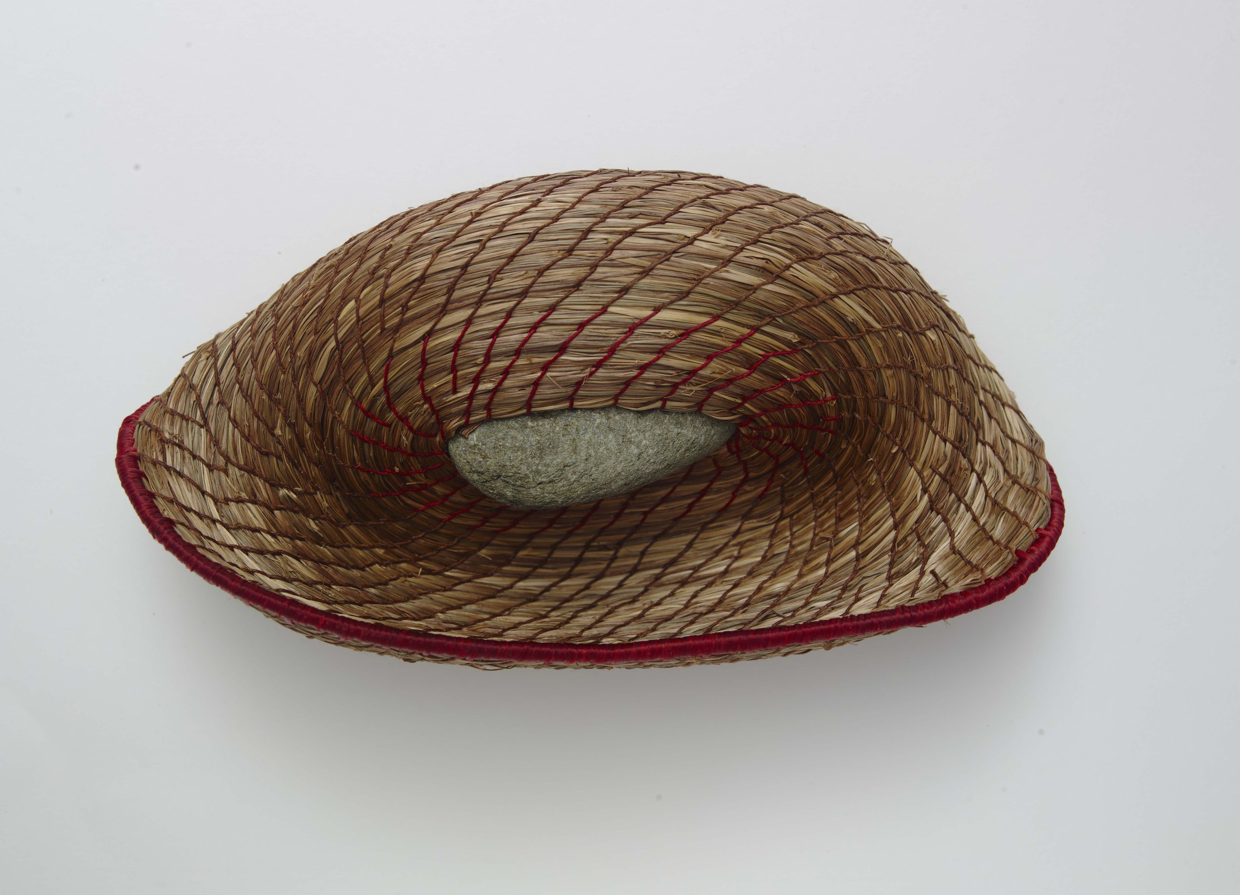 Sweet grass, found stone, waxed linen thread, artificial sinew (coiling, drilling, stitching)