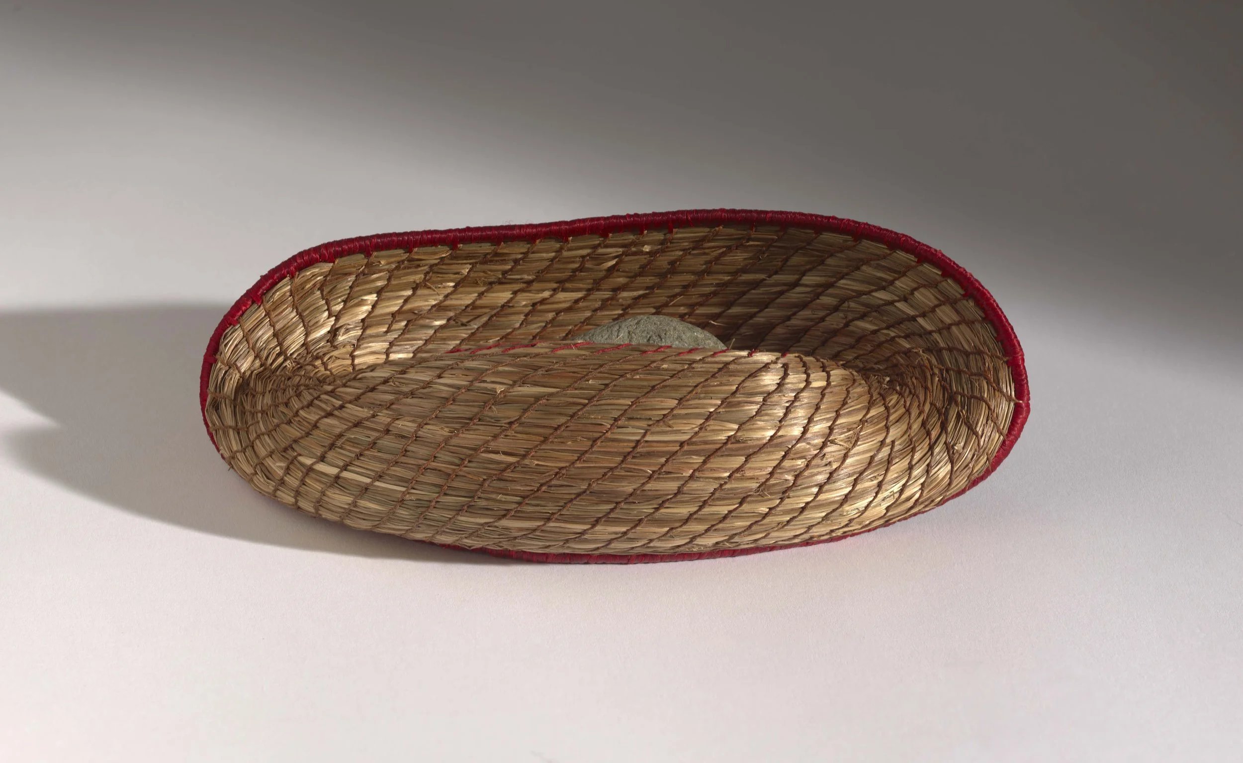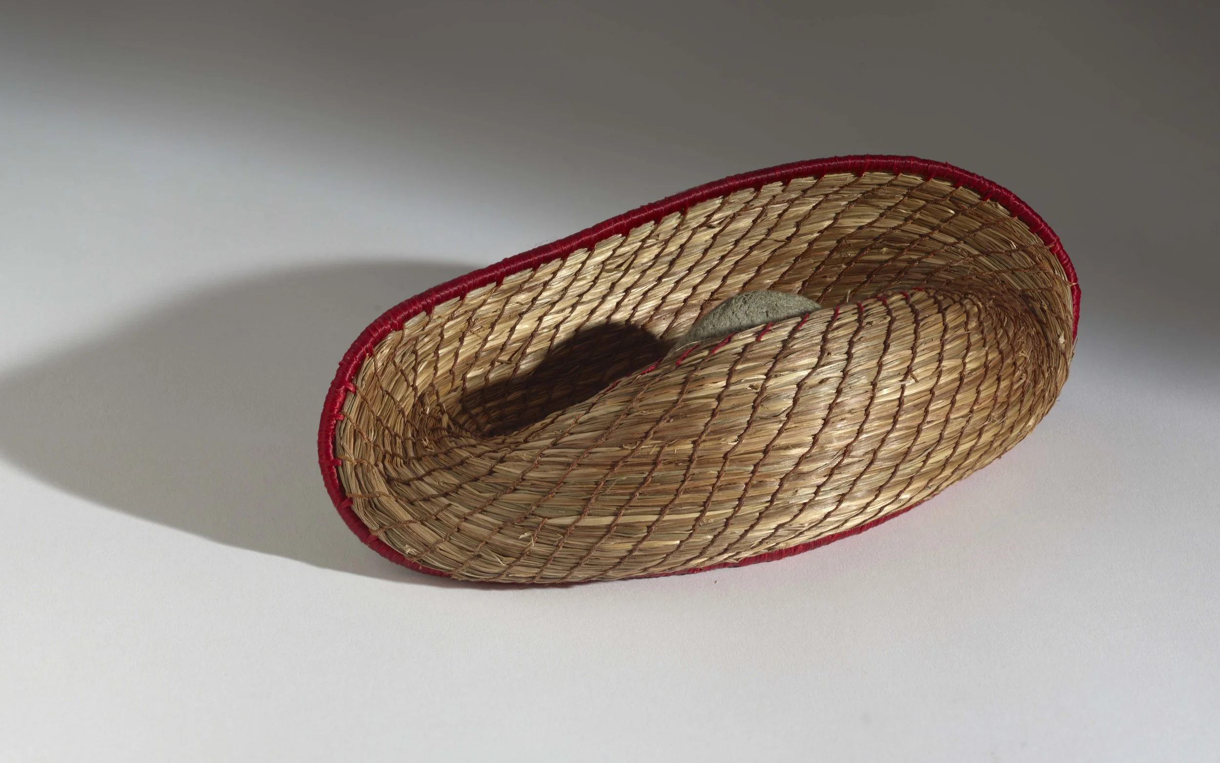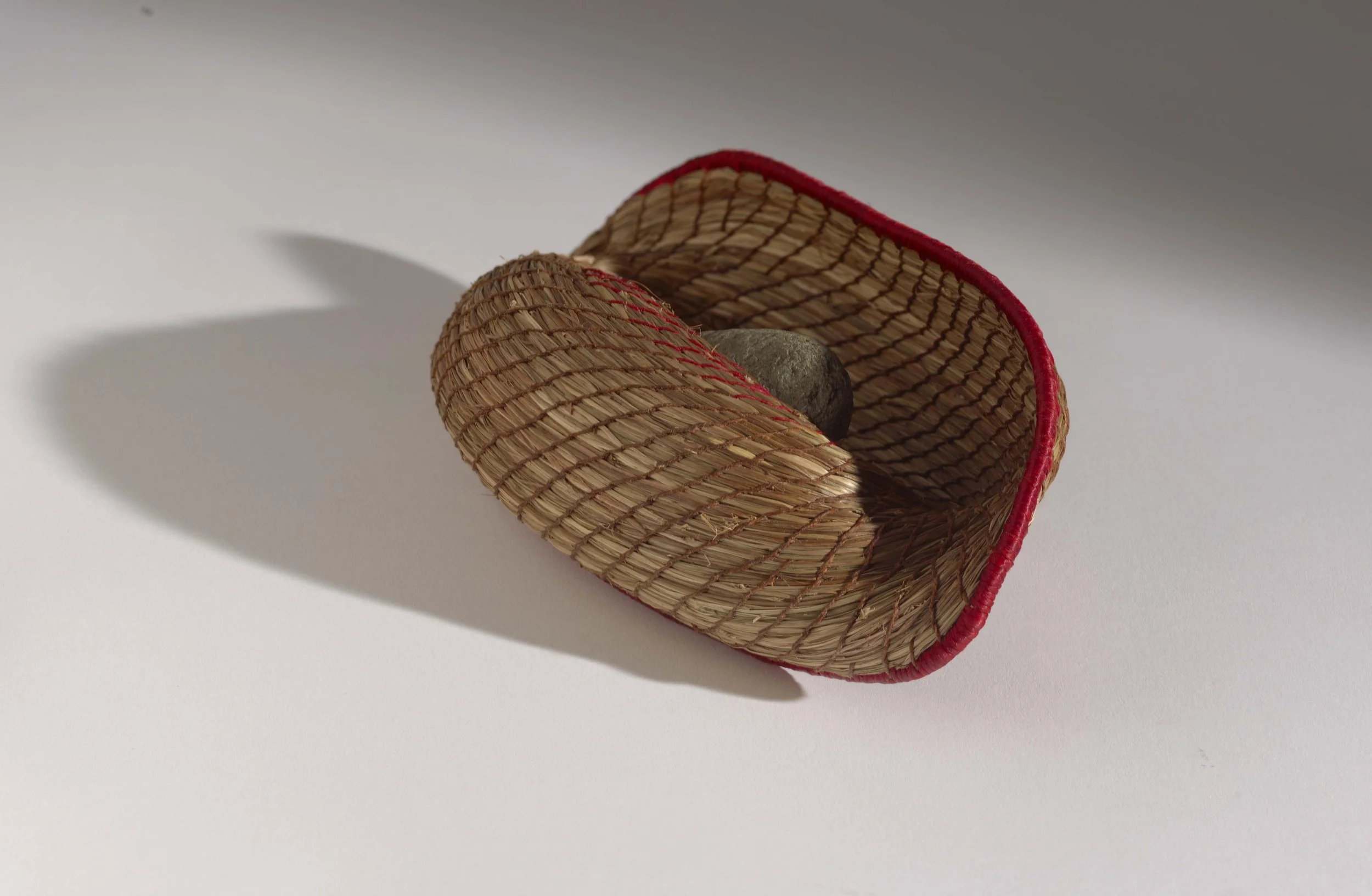 I wove this vessel from natural fiber, folding it inward to hold a found stone and binding the edge with artificial sinew. The waxed linen thread provides both structure and detail, emphasizing the curves. Form emerges from use: folding, containing, balancing. Nothing is hidden or symbolic beyond the act itself—materials doing what they do, held in a temporary agreement.