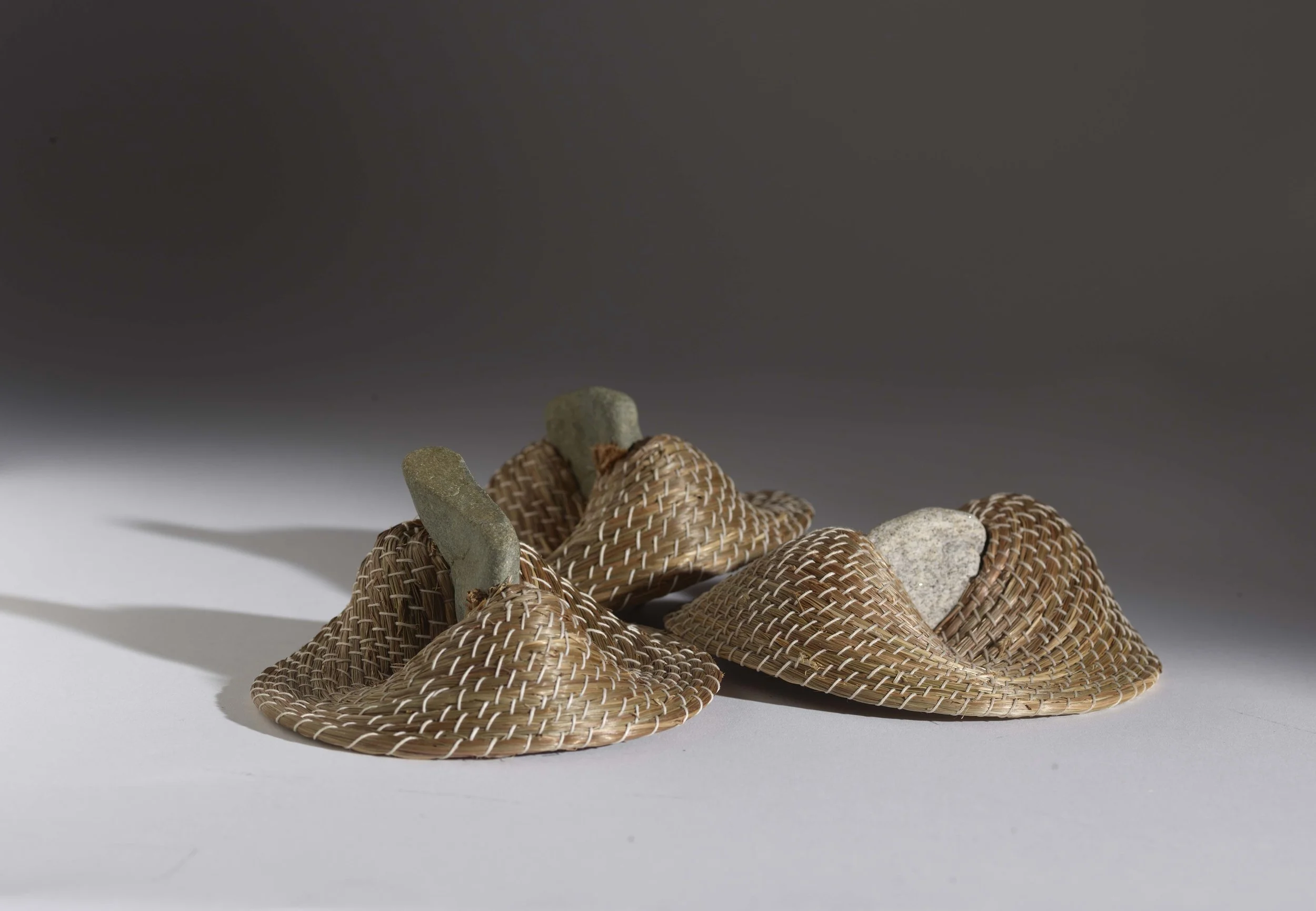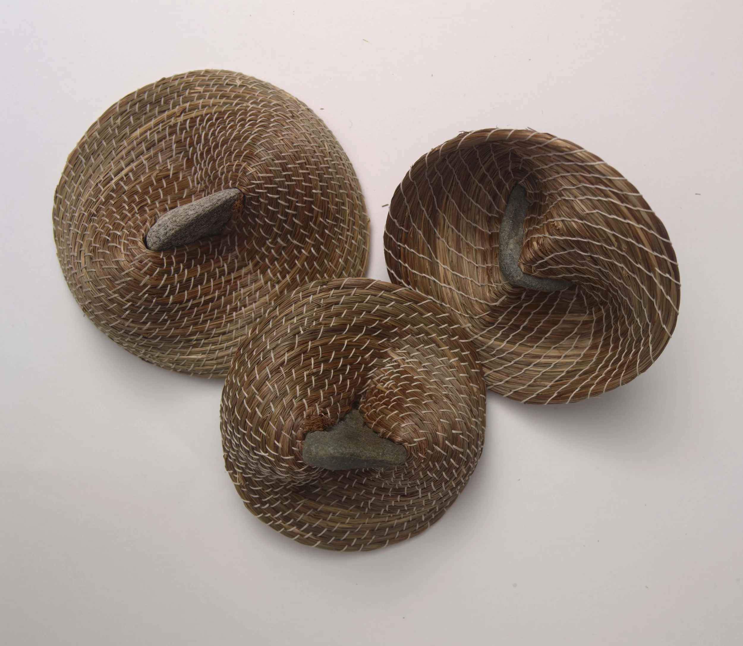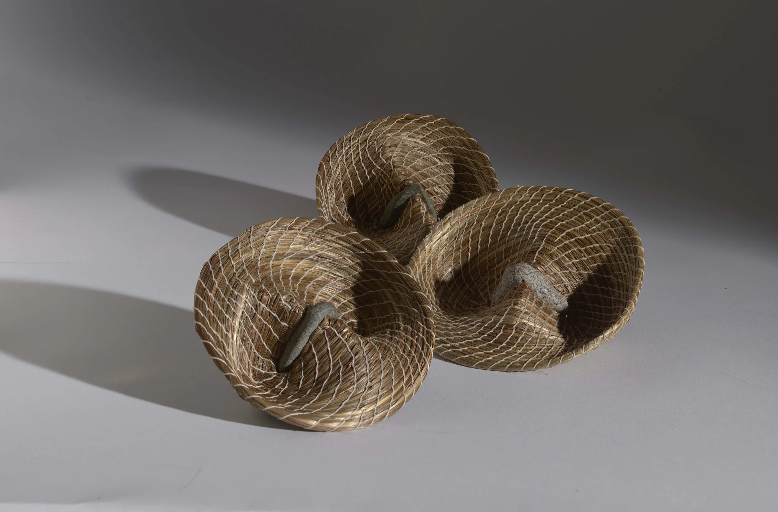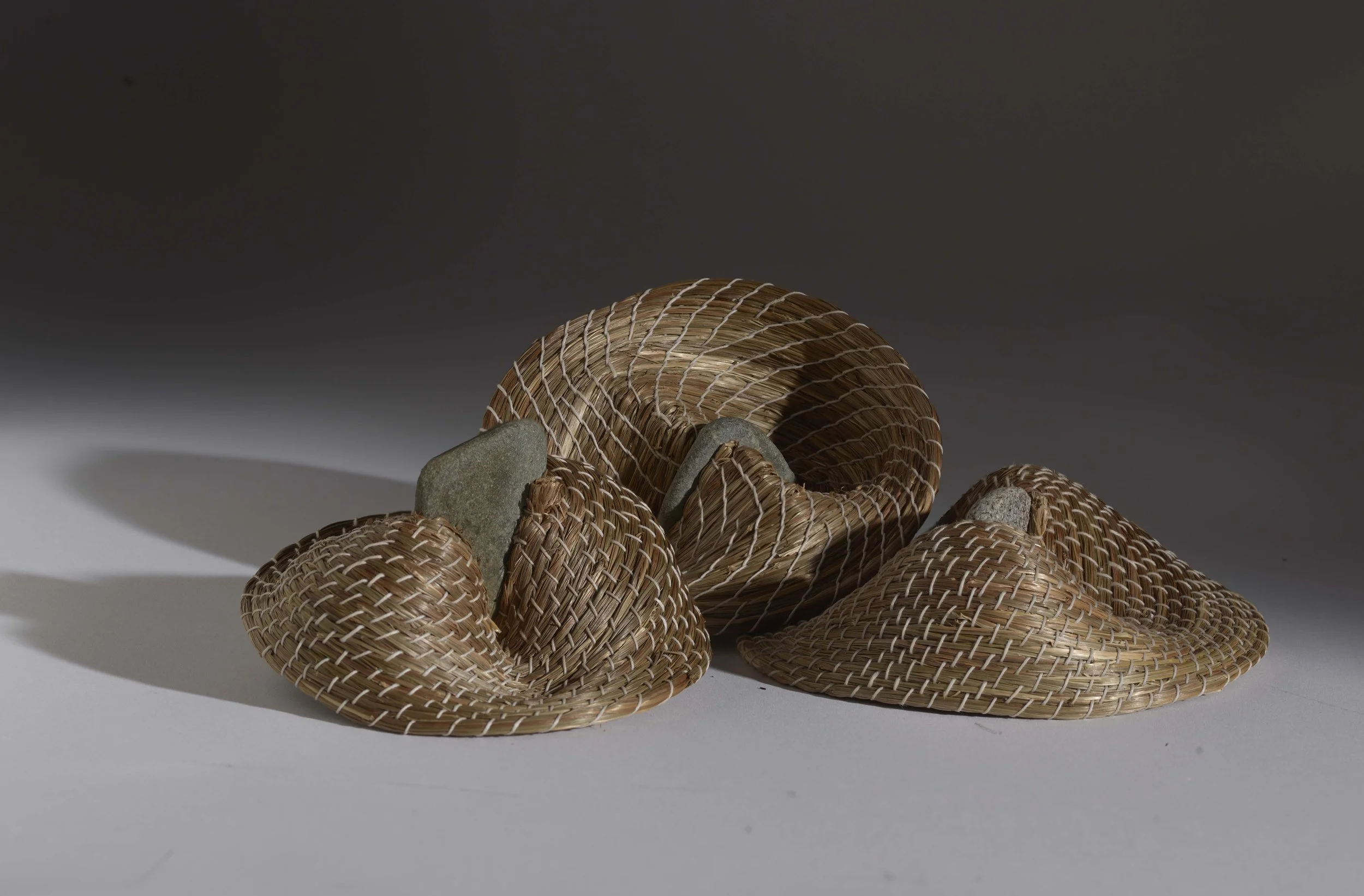 This is a form I return to often because it reminds me of an owl's beak. Each is made of natural fiber, stitched tightly to hold its shape, and fastened firmly at the center with a stone. The coil turns inward until it becomes dense and self-supporting. The pieces are complete when tension, gravity, and the material reach equilibrium.