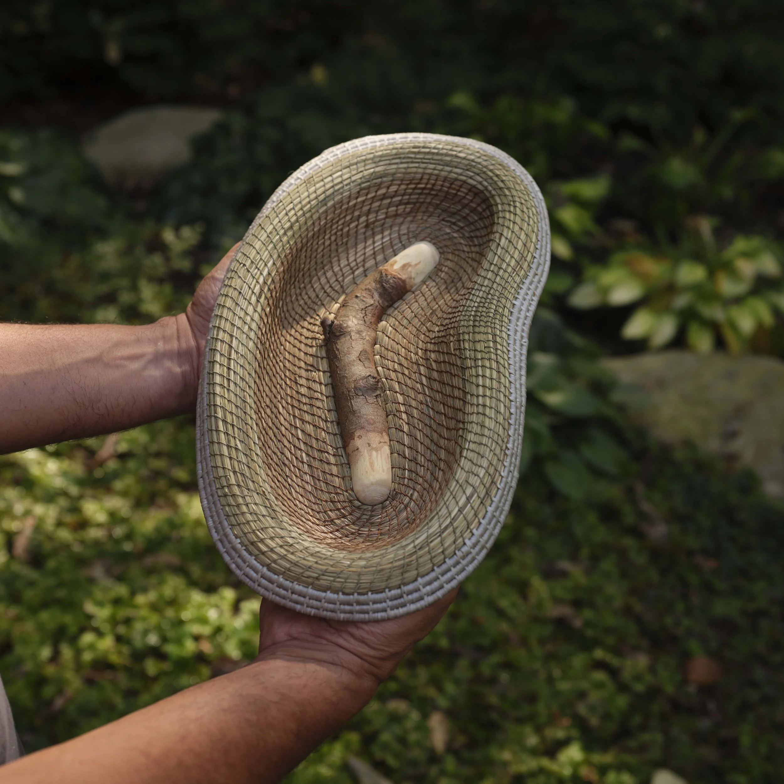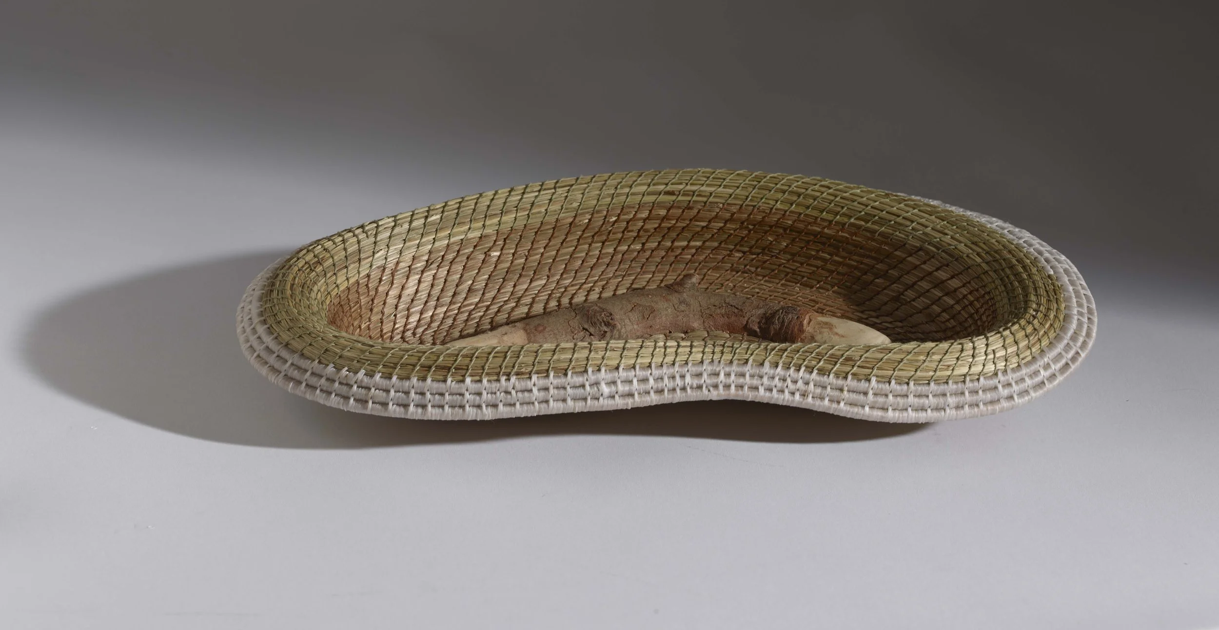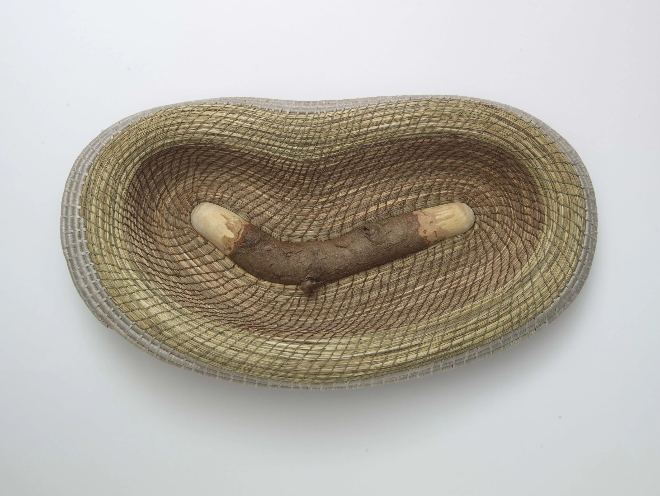 Sweet grass, swamp oak, waxed linen thread, artificial sinew (coiling, drilling, stitching)