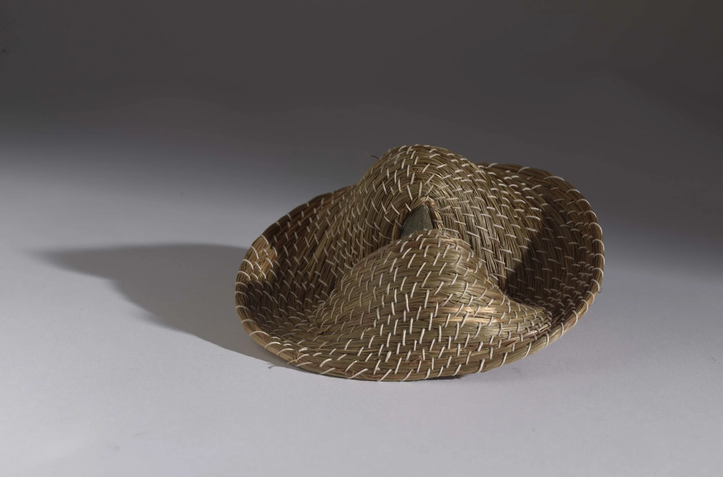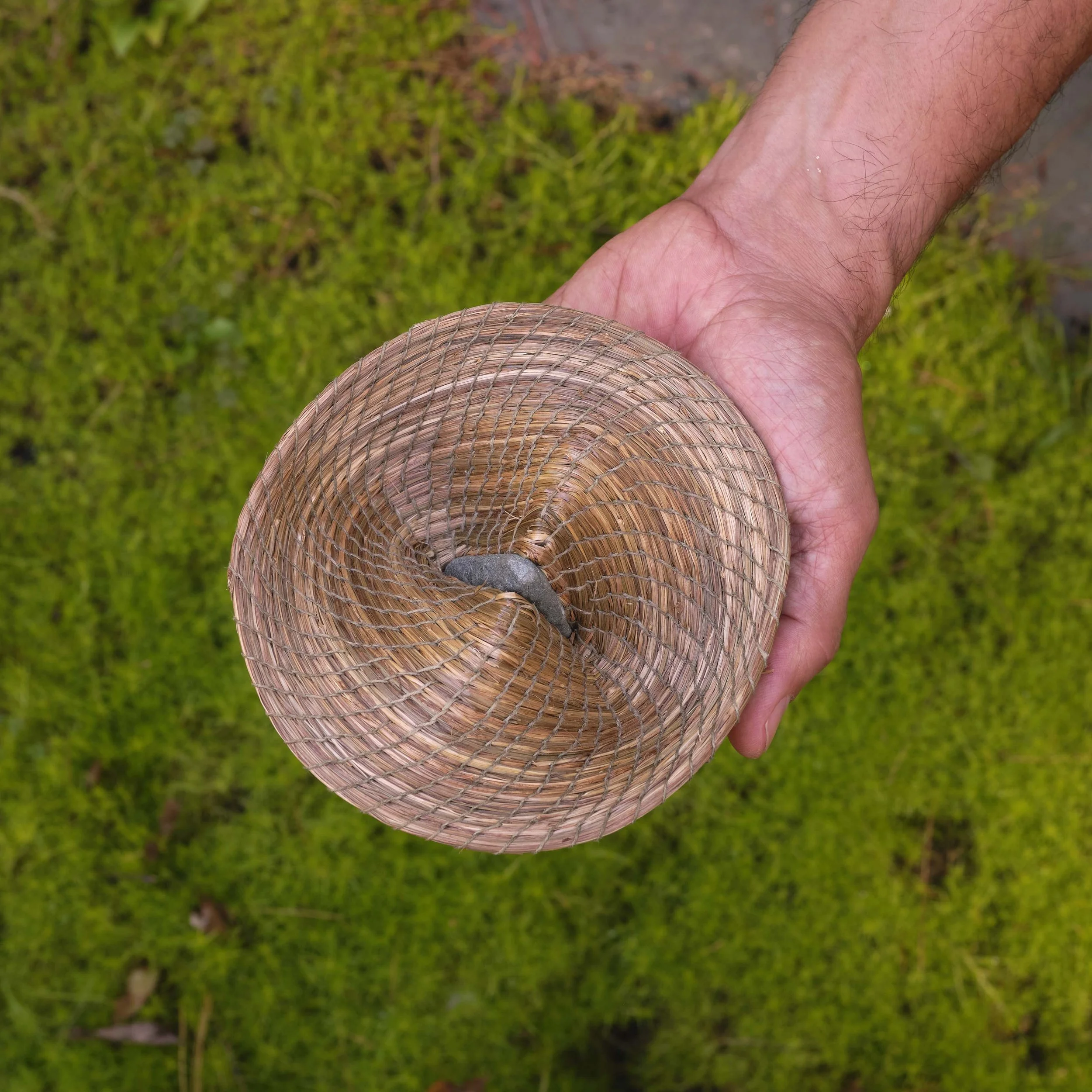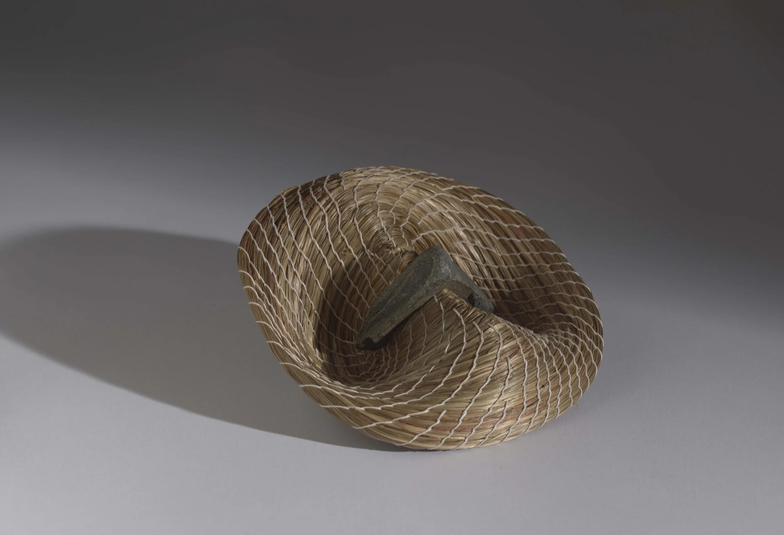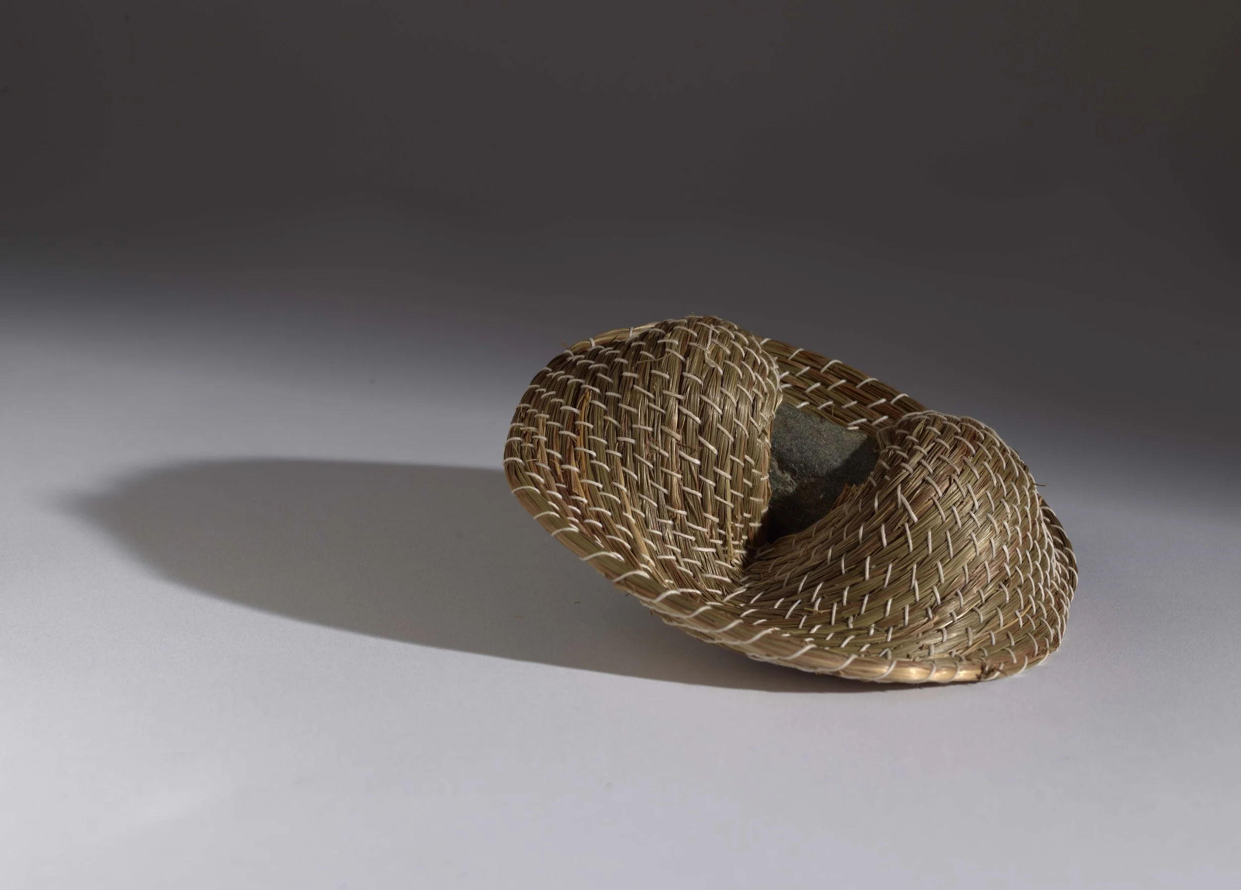 This woven form combines natural fibers with a contrasting found stone at its center. The spiraling design creates a dynamic, fluid shape, while the stone disrupts the otherwise organic flow. The interplay between the soft, textured fibers and the solid, angular stone invites reflection on the balance between the two.