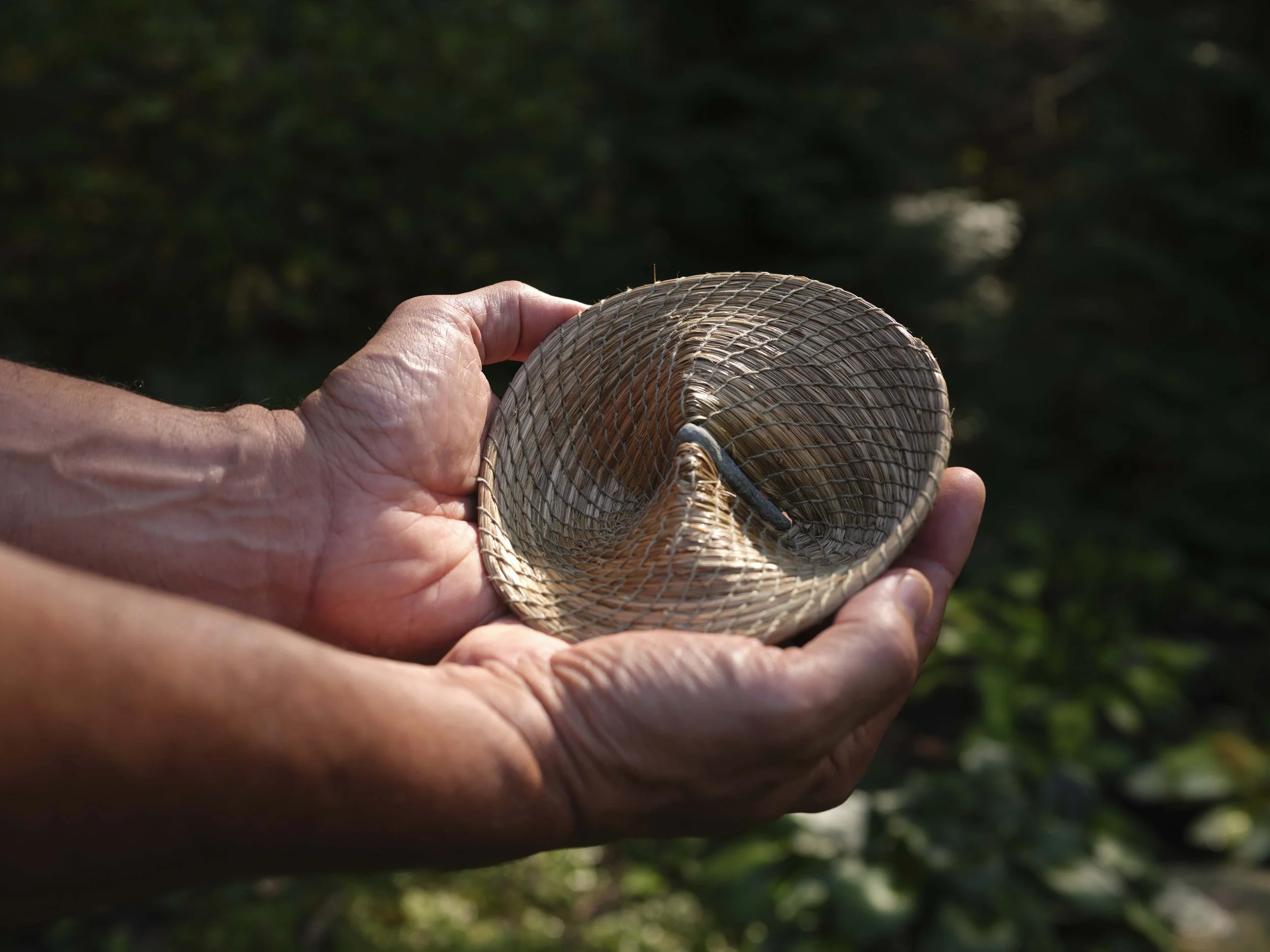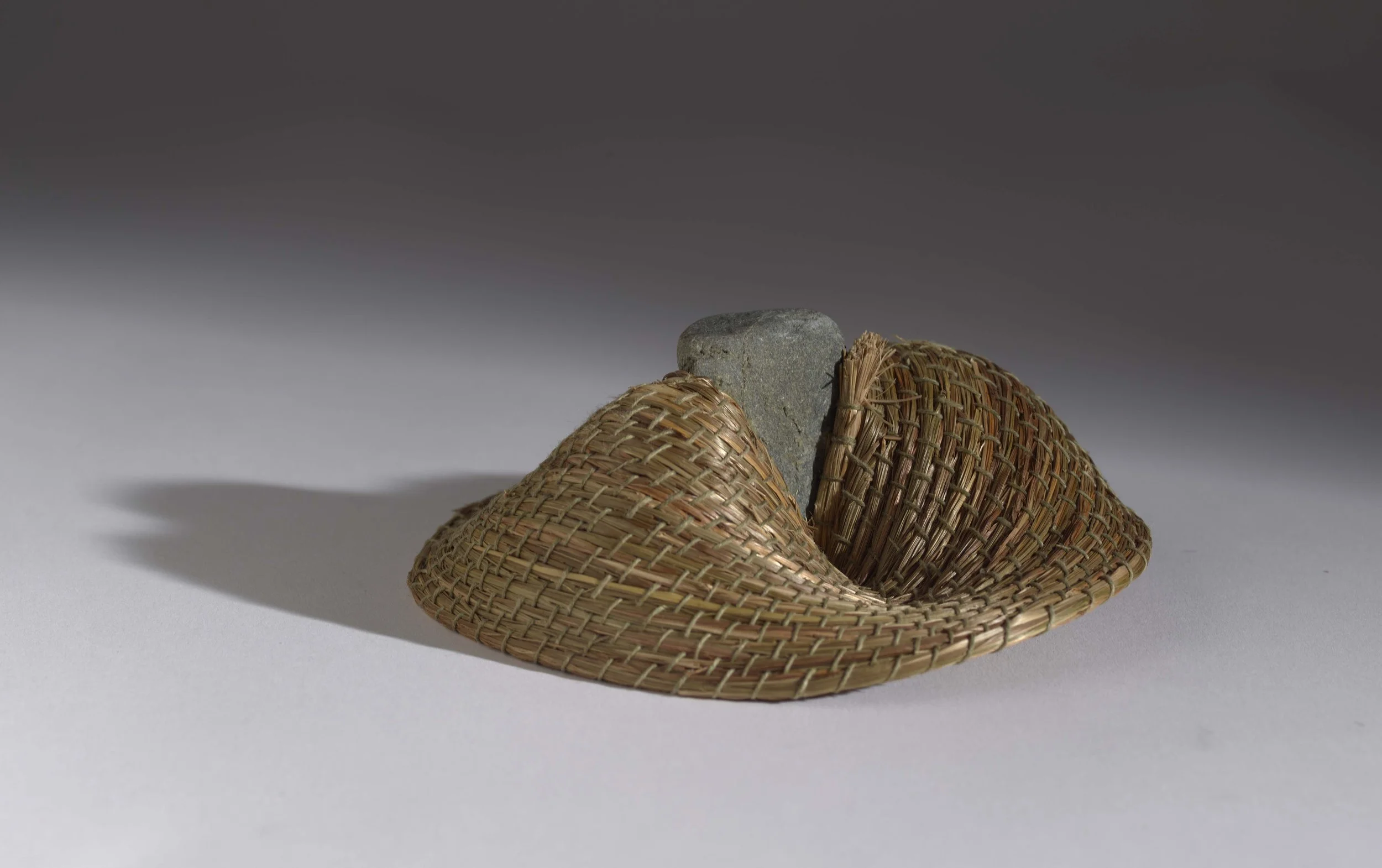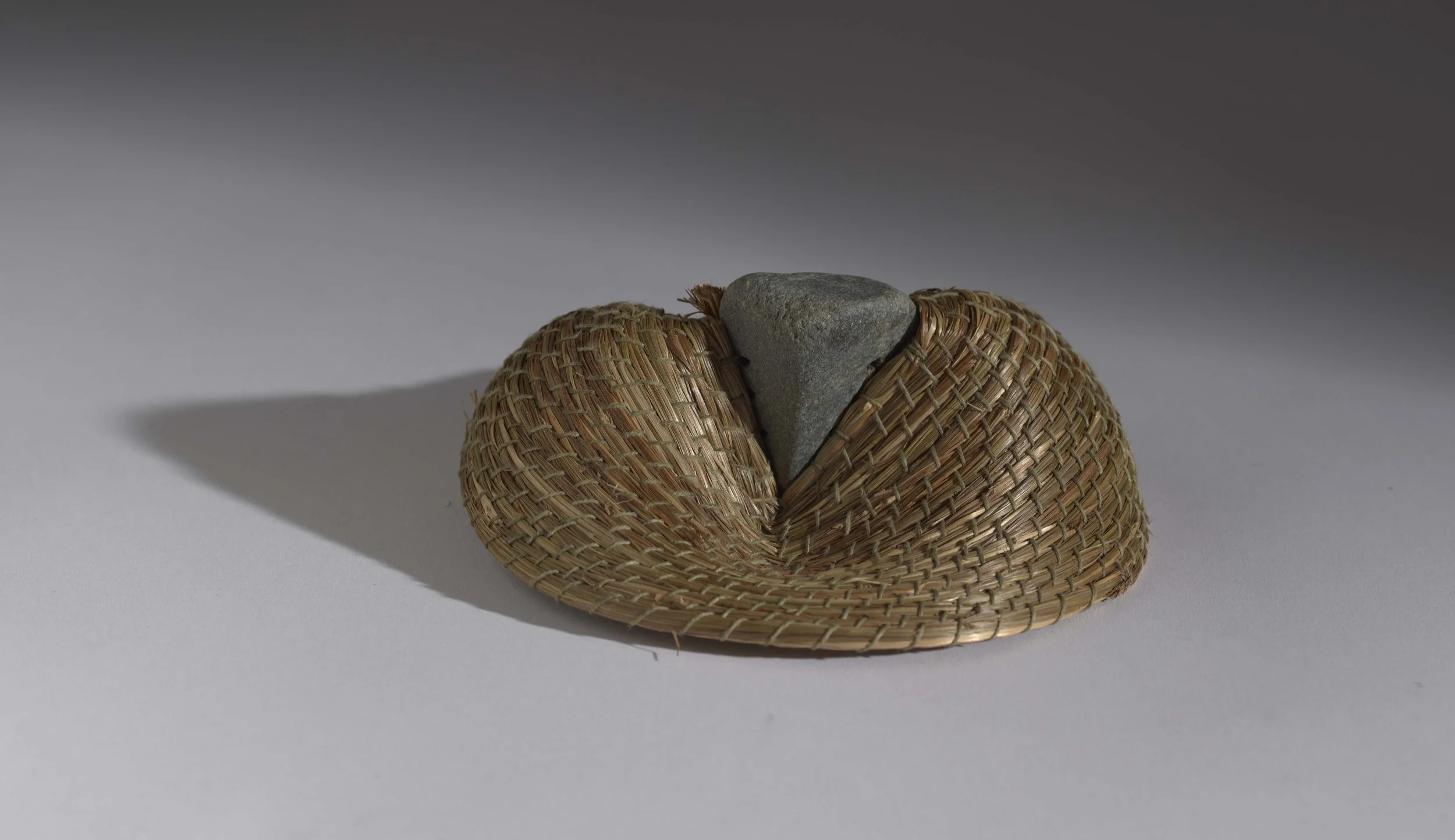 Sweet grass, found stone, waxed linen thread (coiling, drilling, stitching)