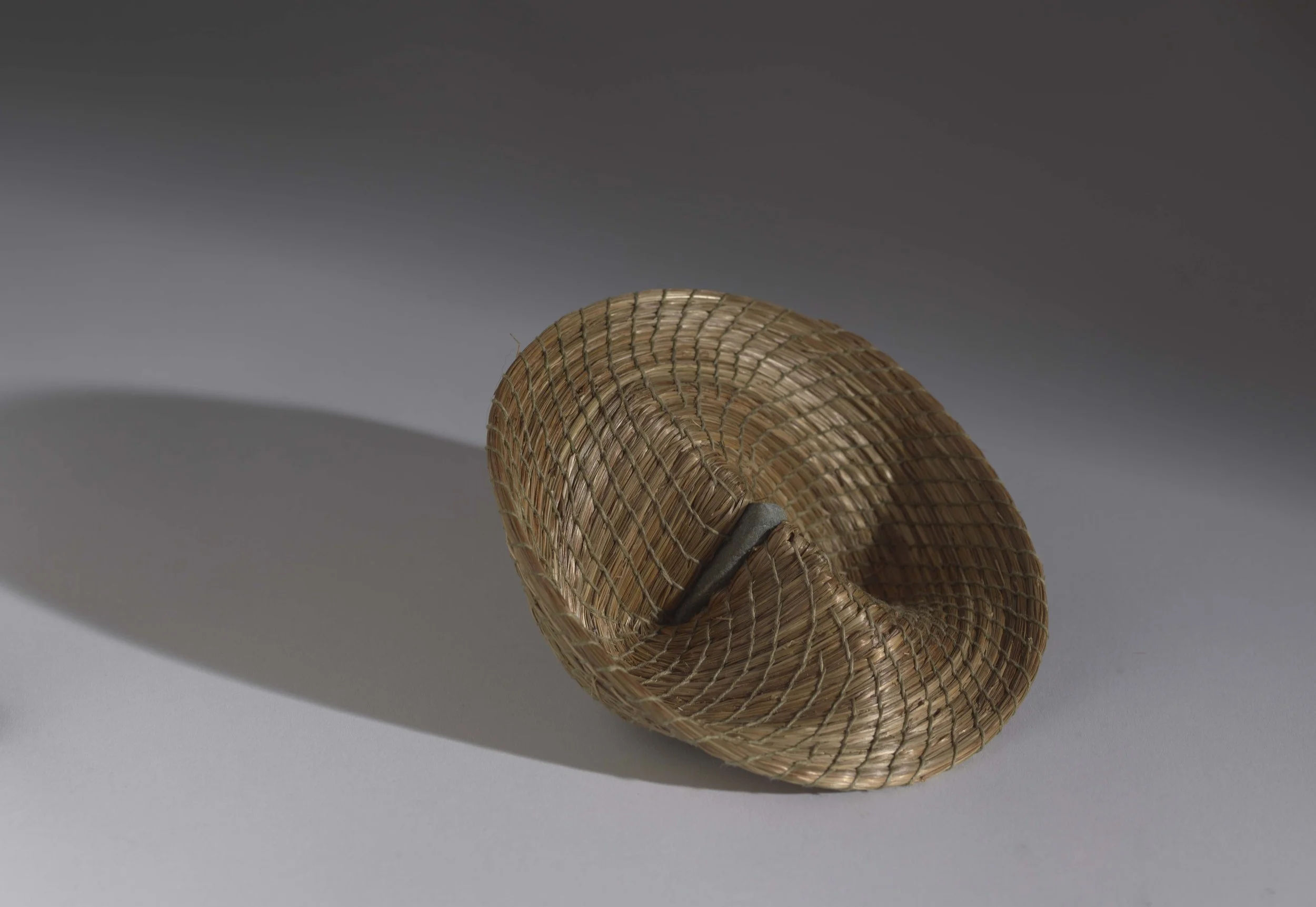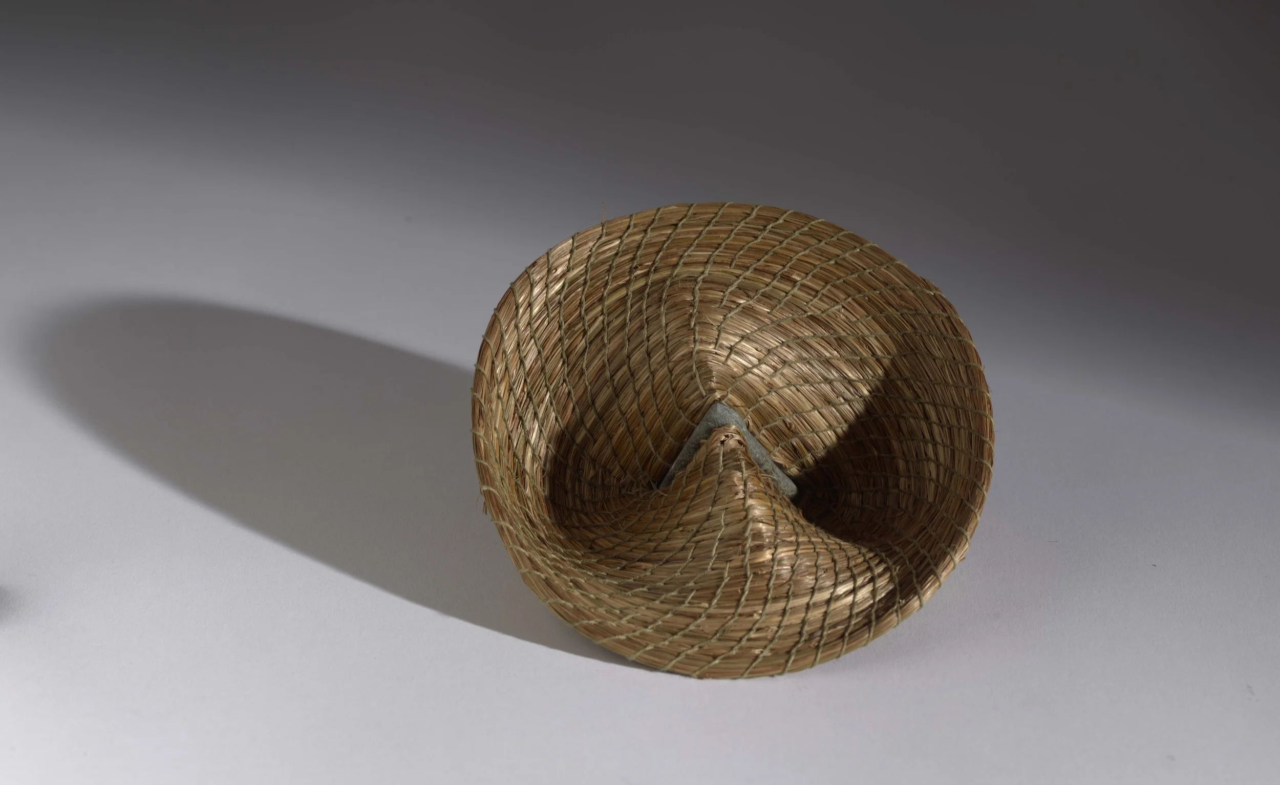 I coil natural fibers affixed to a found stone into a continuous spiral. The form seems to compress, folding inward. A small stone wedge arrests the motion, fixing tension and shadow in place. The vessel reads as both a container and a gesture, recording pressure, resistance, and the balance between pliable fiber and rigid stone.