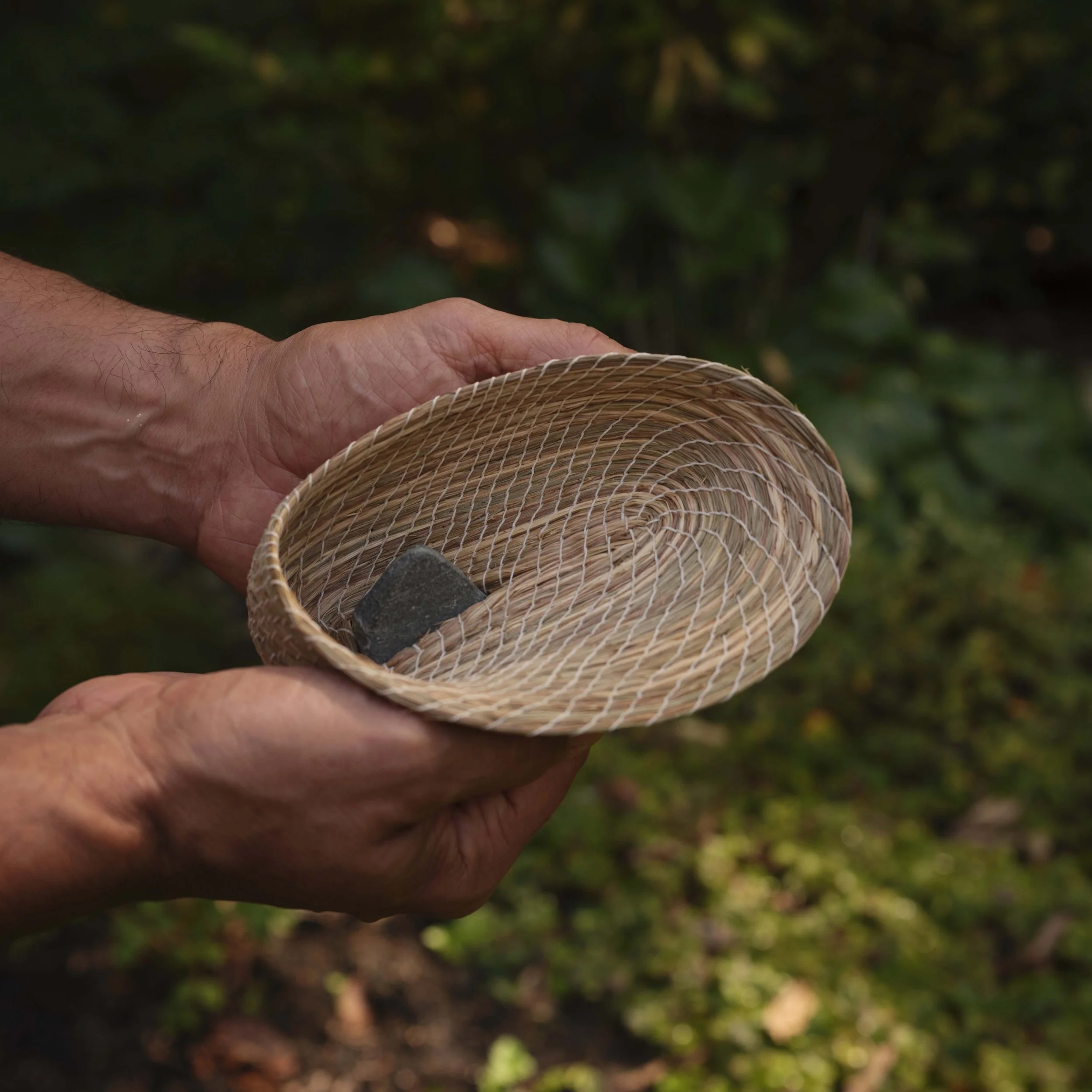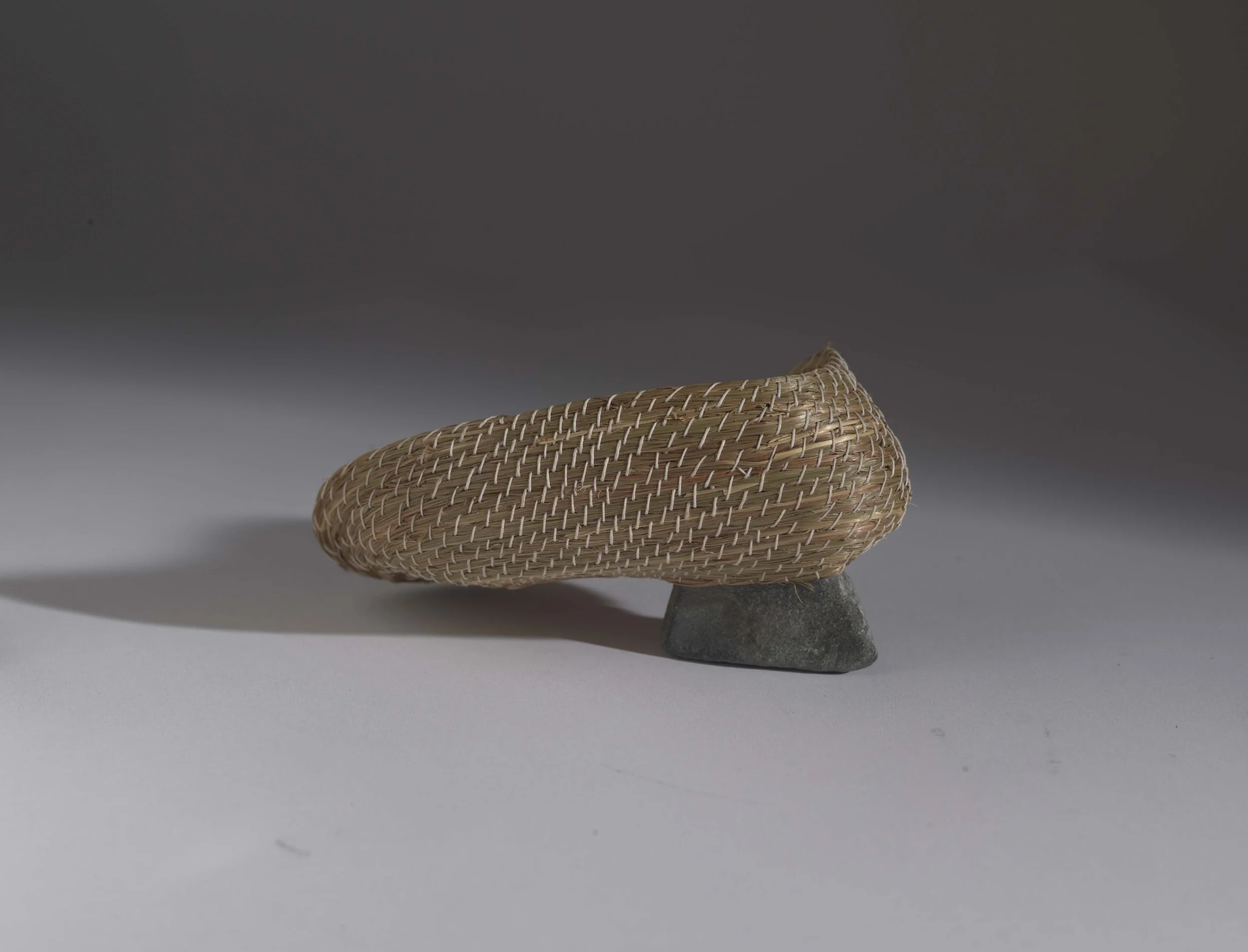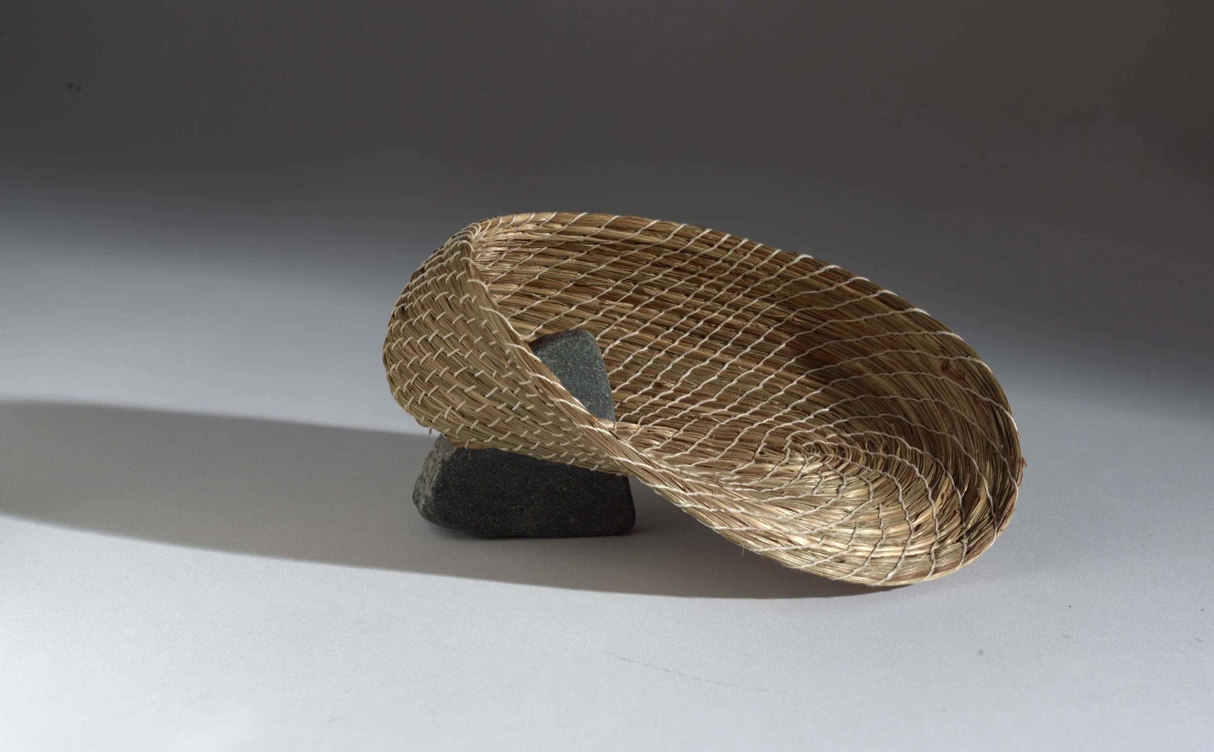 I wove this form from sweetgrass, attaching and balancing it on a found stone to explore weight, tension, and trust. The basket form leans, seemingly held by gravity and friction. I’m interested in how humble materials demand precision and how light and shadow reveal structure, vulnerability, and a quiet, working resilience.