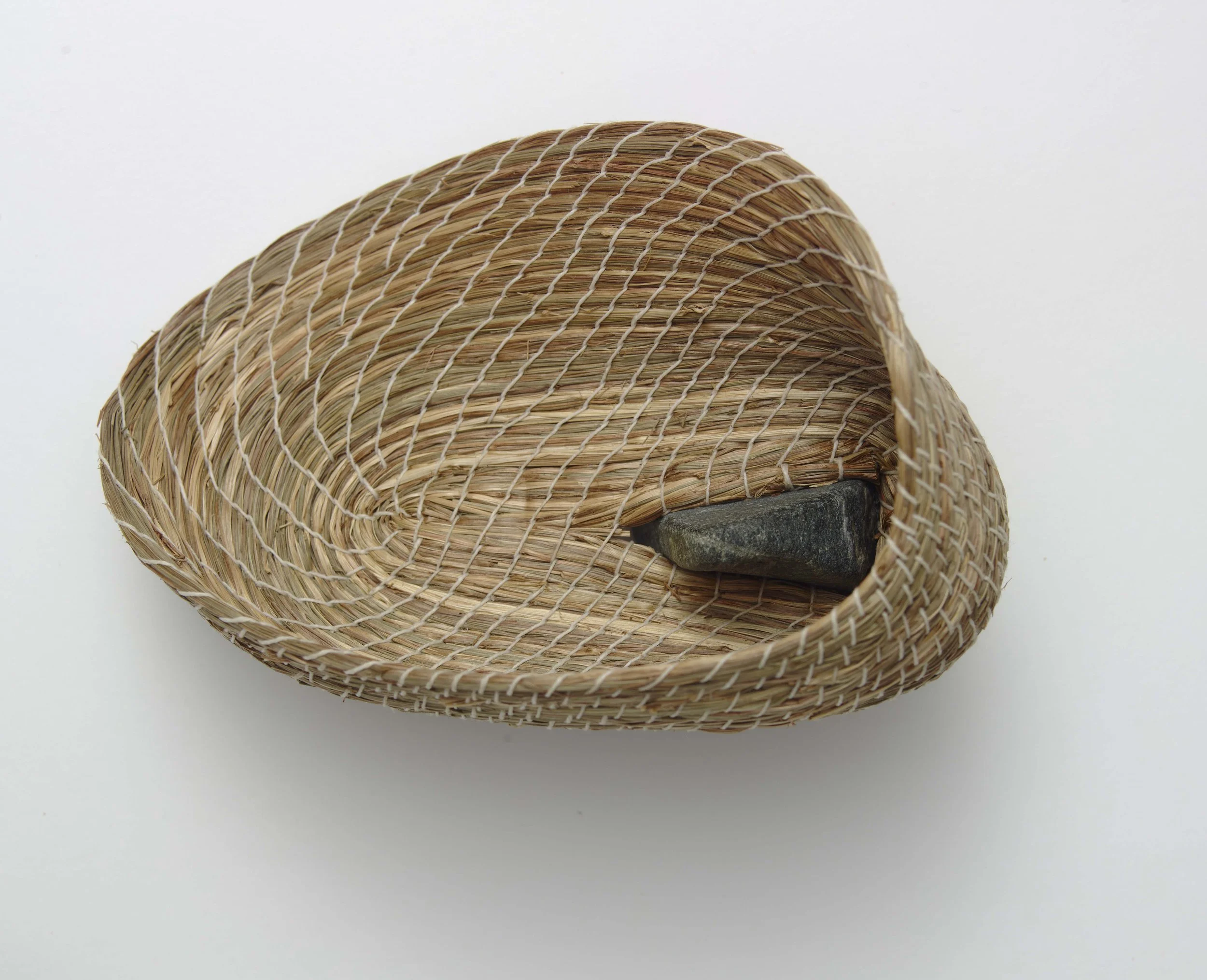 Sweet grass, found stone, waxed linen thread (coiling, drilling, stitching)