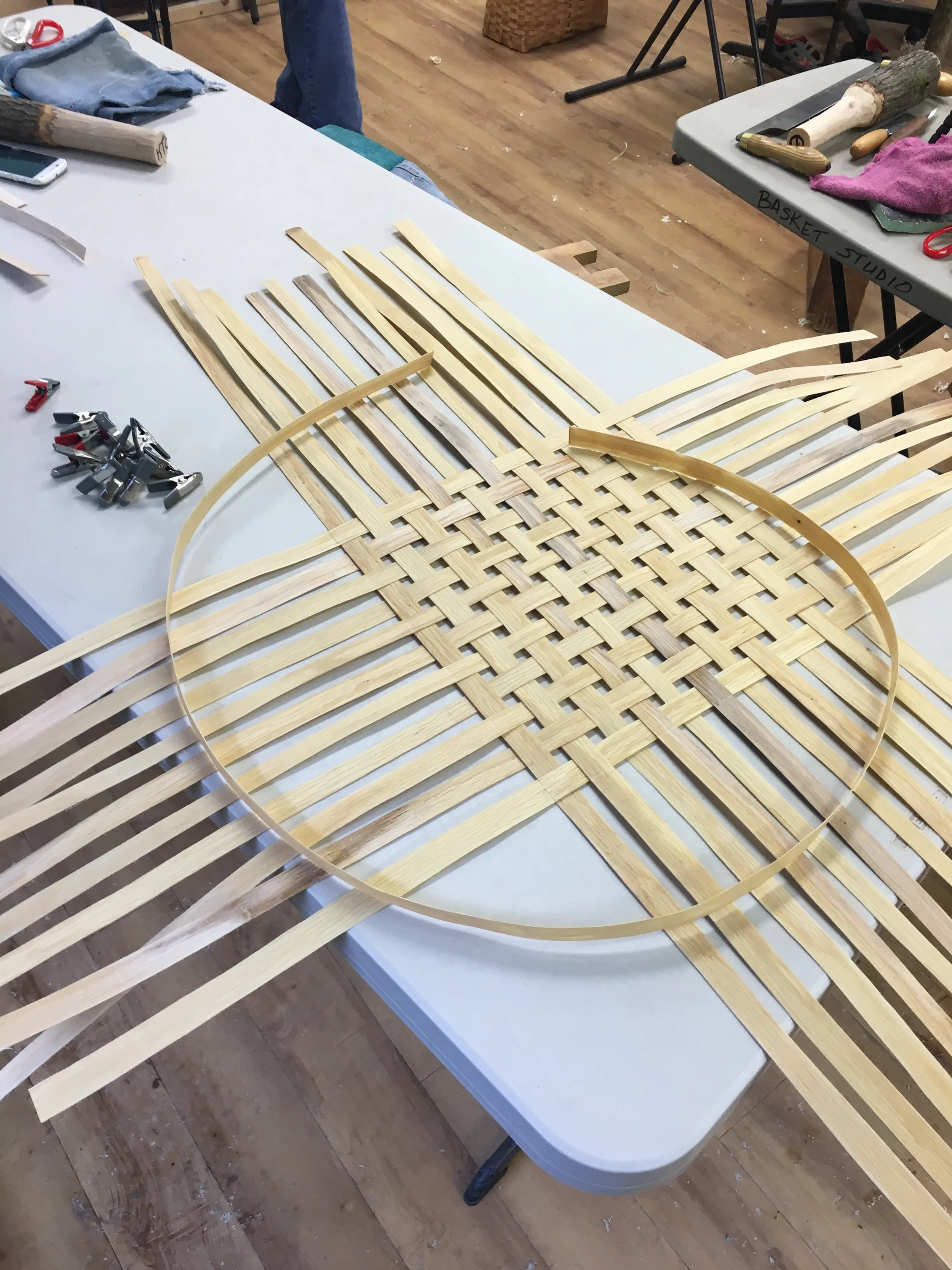 The final day started early, with work on the rims. I had the rough heartwood pieces soaking in water, and got into the studio before breakfast on this final day to shape and finish them, and get them on the basket. Once they were done and sanded, I inserted my two handles on opposite sides of the basket. These I had bent myself which was a nervous experience; after so much work I didn't want them to crack or break which would have meant starting over. Using my thumbs, I followed Bill's direction and slowly 'worked the fibers' of the oak to bend. With the handles bent, they were inserted, I added the rims, held all in place with zip ties. I was now ready to do lash the rims, making the basket top secure and strong.