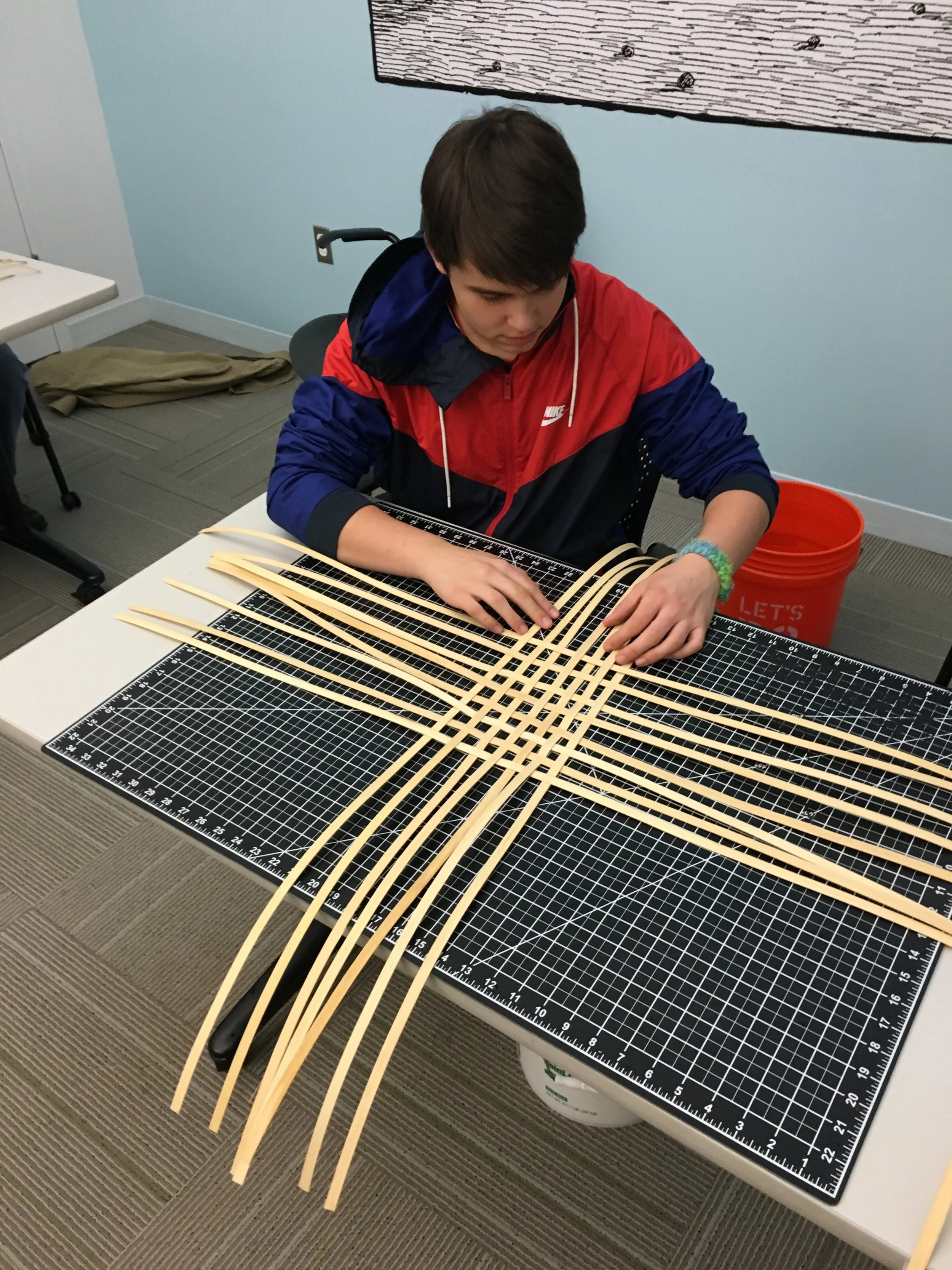 With the room to myself, I set up a display of many different types of baskets that I've been making over the past months. These included willow, black ash, bamboo, and reed baskets. They would give visitors an overview of some of what is possible when weaving baskets. I didn't really know if I'd be demonstrating or having folks actually make baskets, but was ready for either. I had decided to share the making of the Japanese 'Knot' basket. This one was perfect for this situation as it teaches some basics about setting up a basket, is quick to make, and yet results in a seemingly complex weaving; all great attributes for beginning basket makers. Since I had prepped the material beforehand the actually making of the basket could be done in 20-25 minutes, even by a novice. I did run a bit short of materials towards the end of the day as way more baskets were made than expected. But then I didn't expect to do two classes of 6 students each; with that type of production material goes fast. (I'll bring extra next year if I'm are invited back...maybe an assistant too).