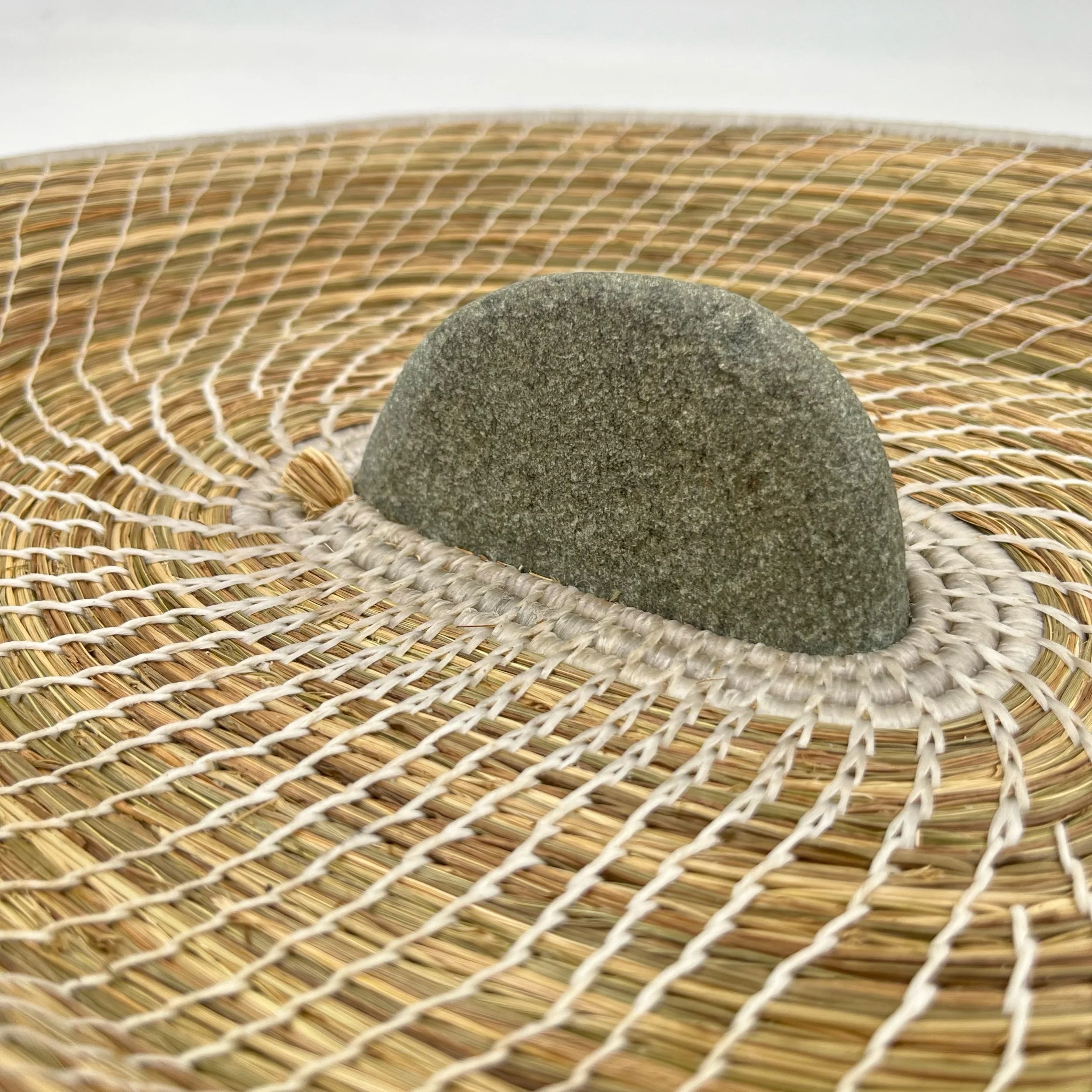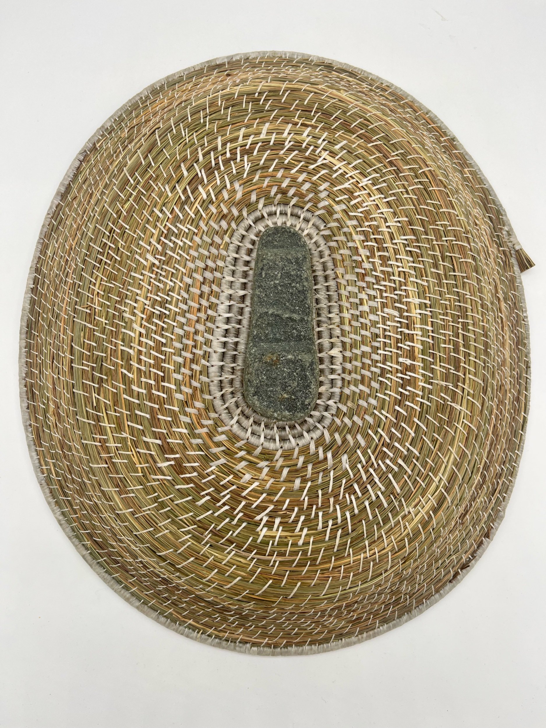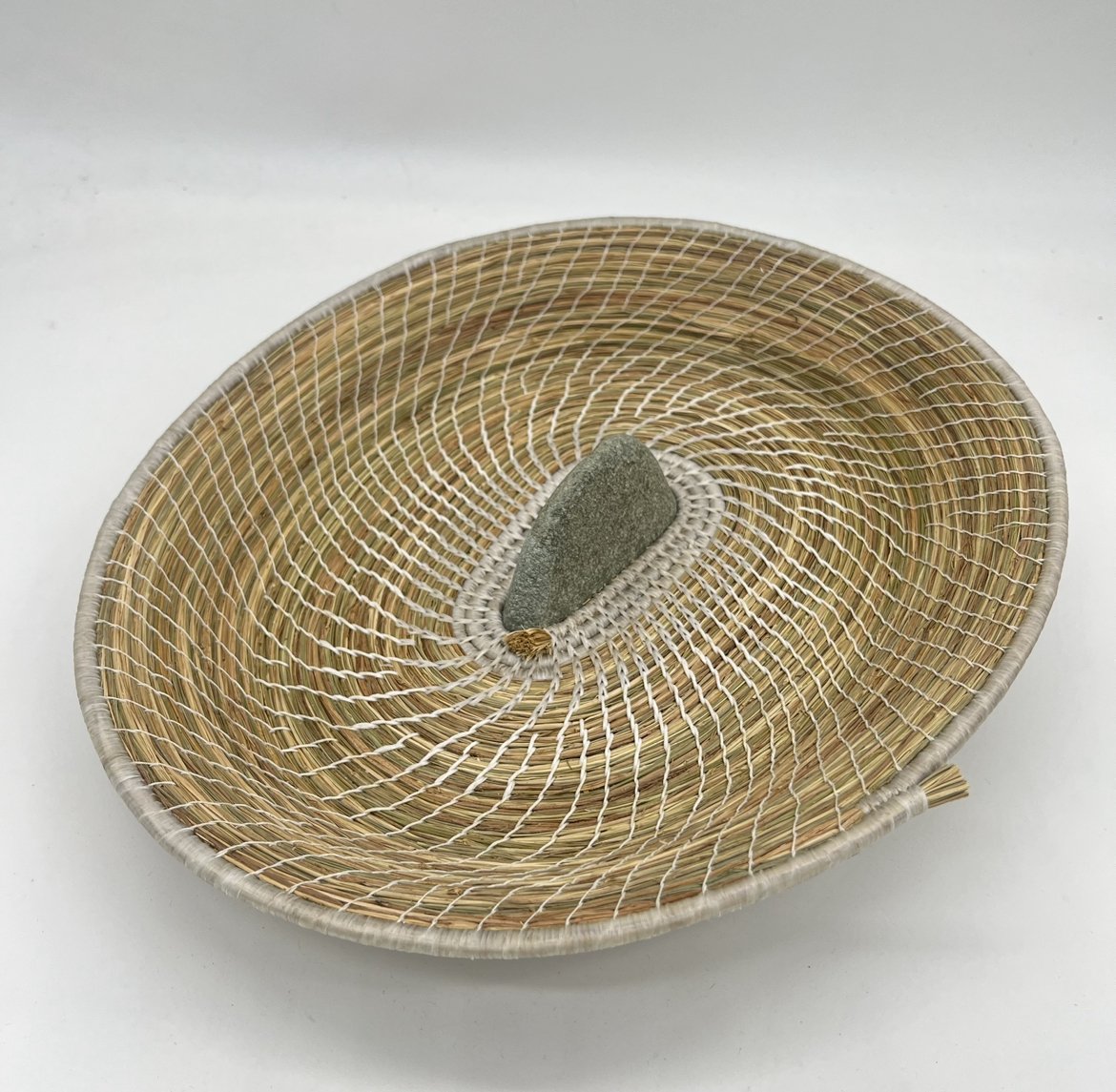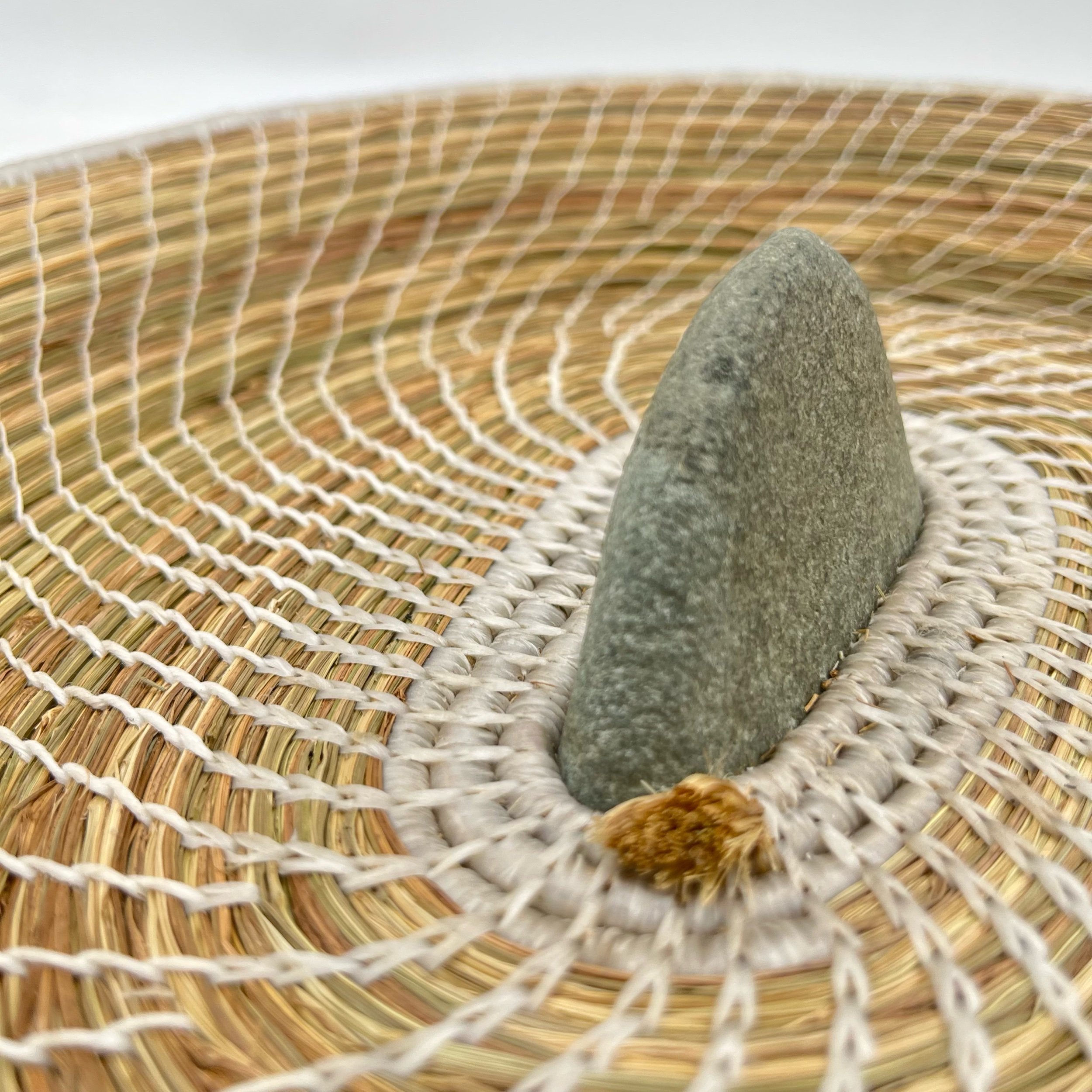 Sweetgrass coiled with artificial sinew and waxed linen thread, attached to a found stone, finished with artificial sinew.