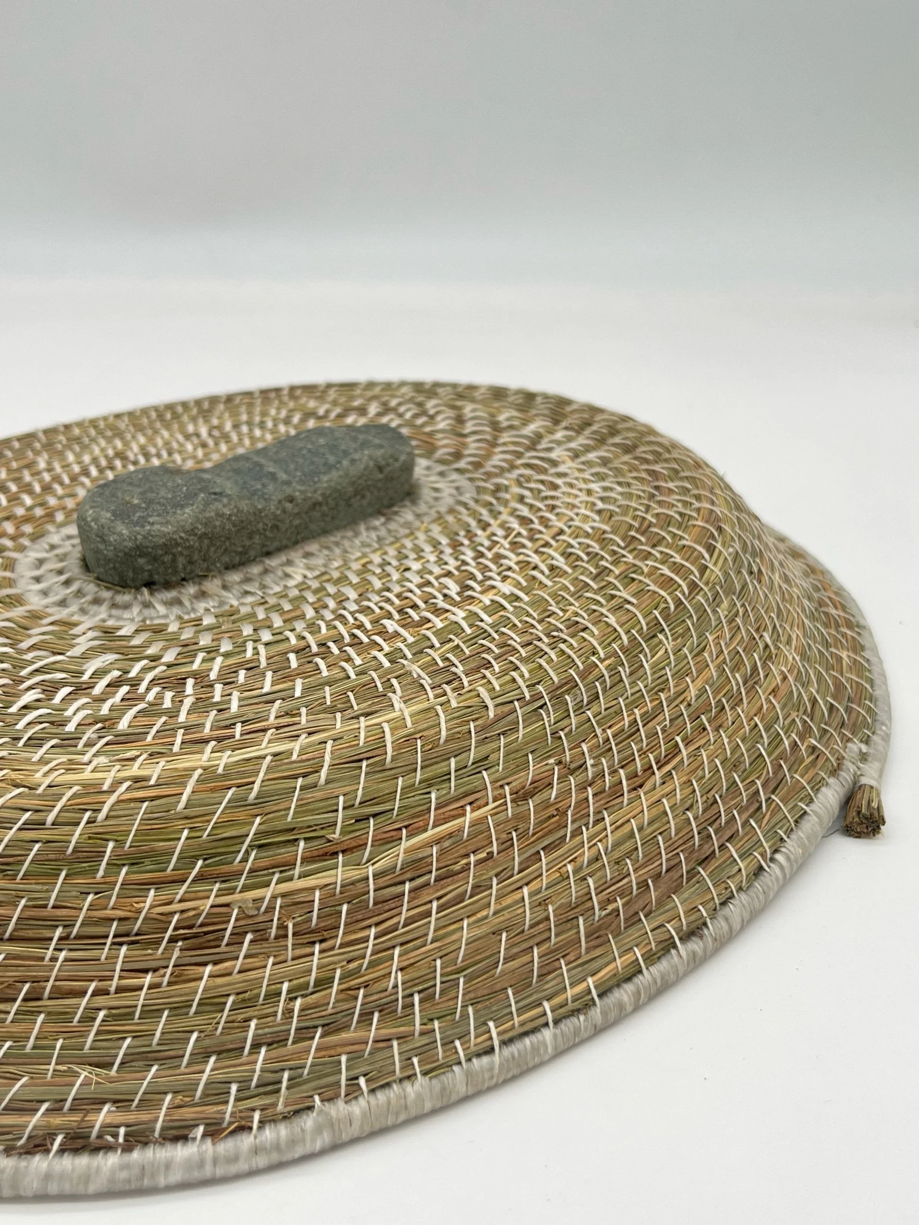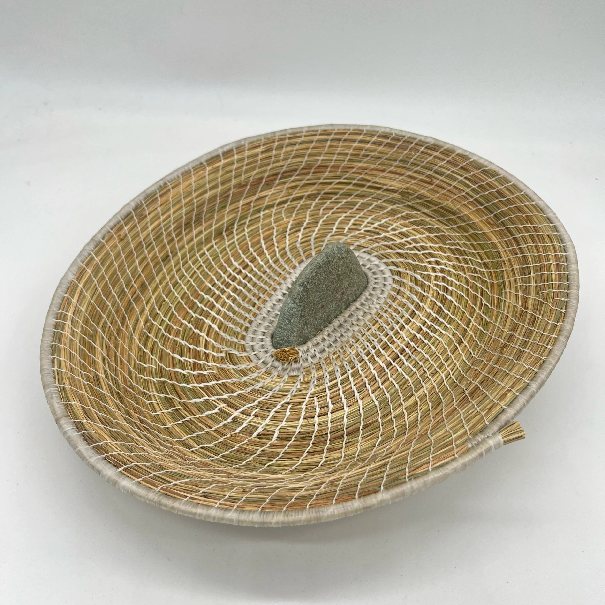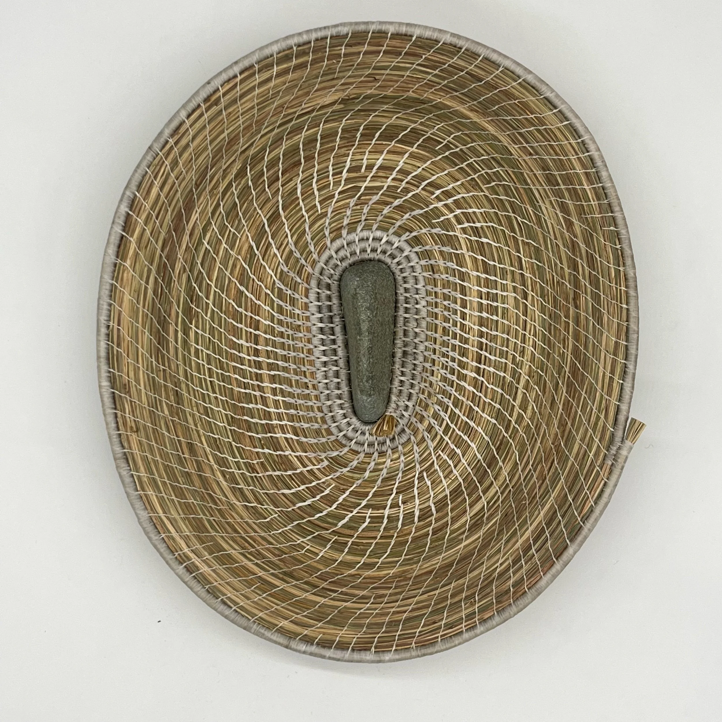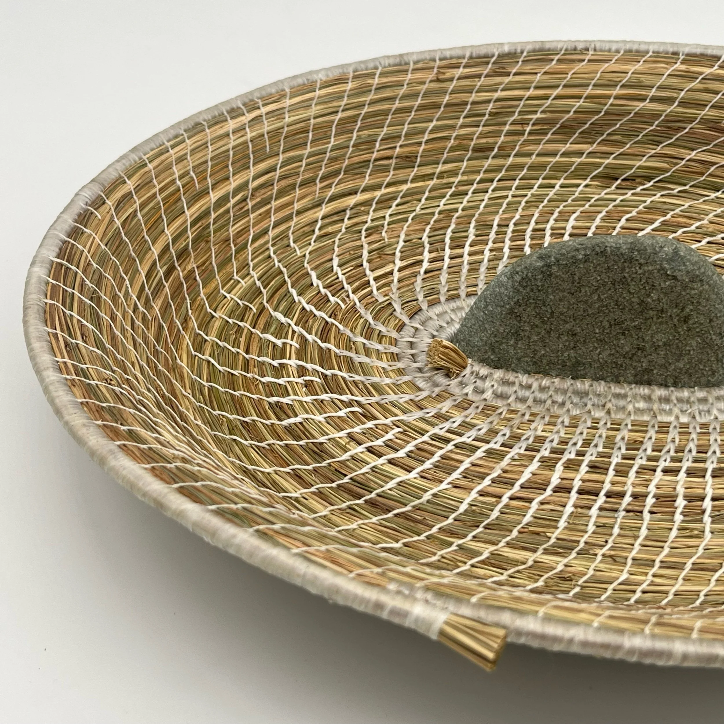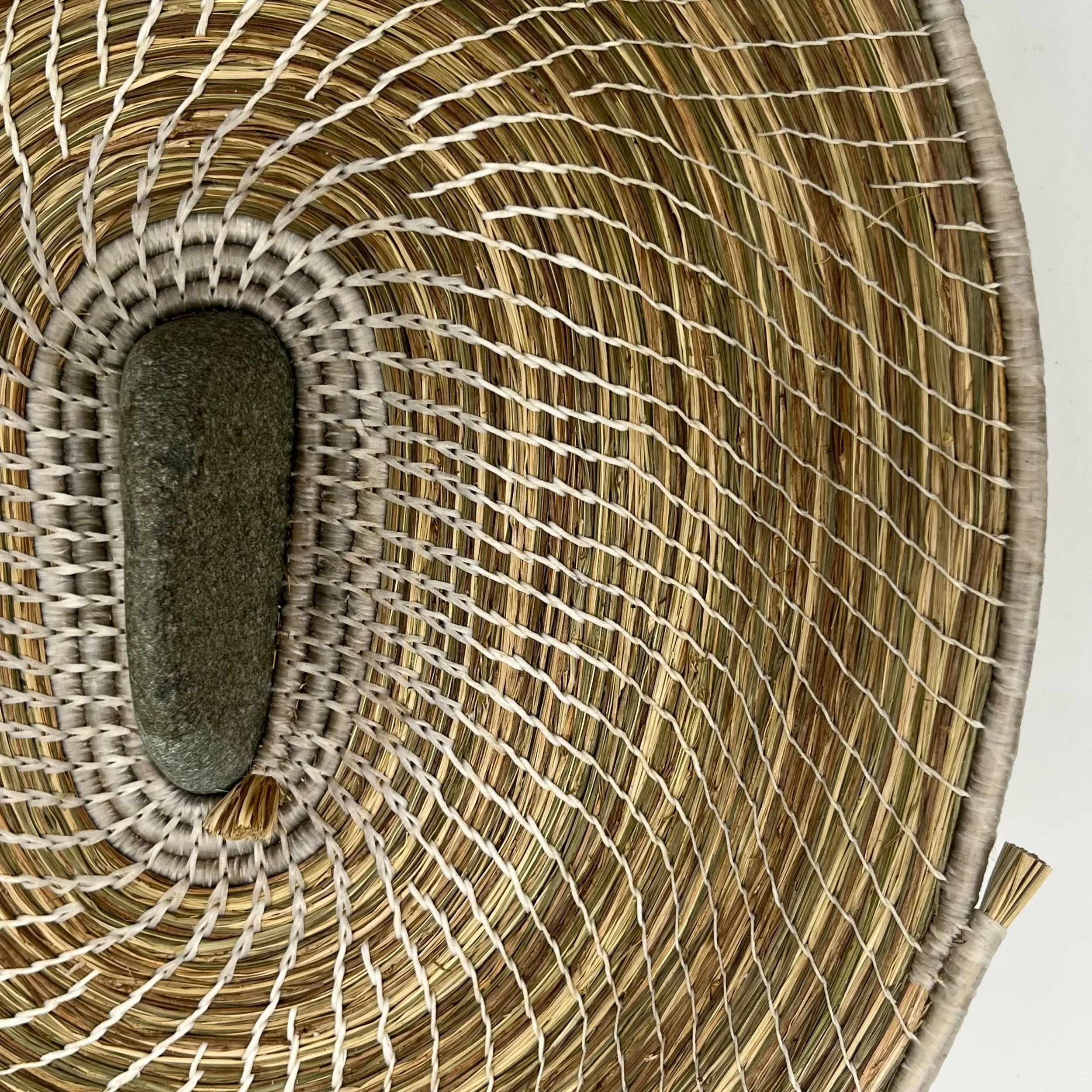 Sweetgrass coiled with artificial sinew and waxed linen thread, attached to a found stone, finished with artificial sinew.